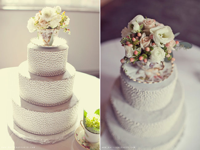 Our hearts started beating a little faster when we saw this swiss dot cake with the teacup topper. So perfect.