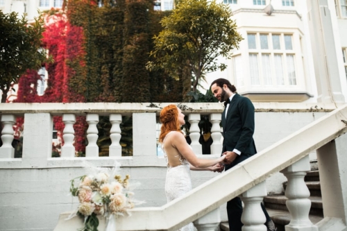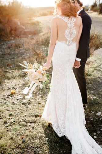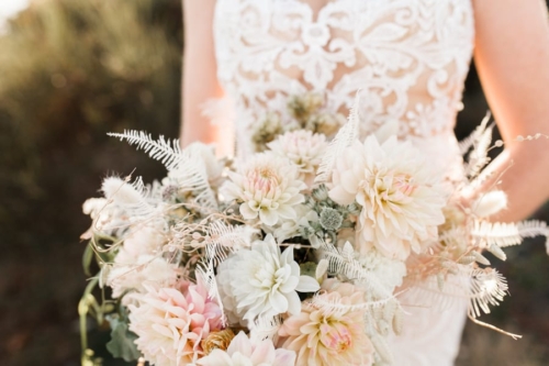 “This styled photo shoot has an soft appealing vintage feel to it with this amazing lace Calla Blanche gown from the Très Chic Bridal boutique and a pastel hand crafted bouquet from Cultivated with locally sourced flowers from Christin’s lush garden.