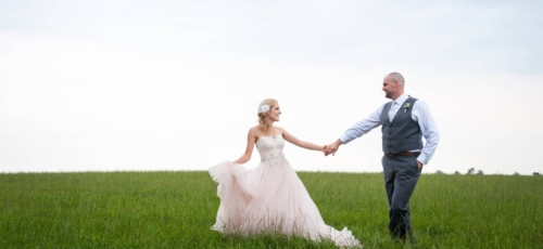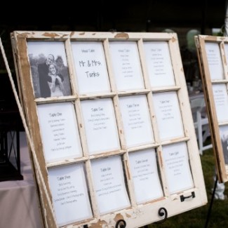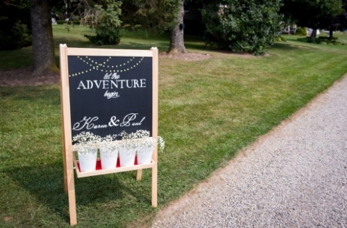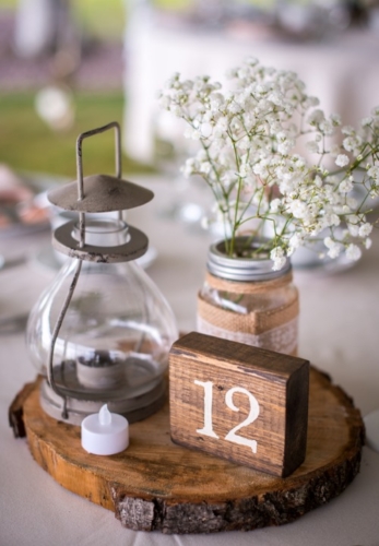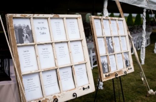 The bride and groom got married on a hillside with large, lush trees surrounding them. The reception was full of lawn games and unique rustic decor. The large tents provided shade as the wedding was cozy and unique.