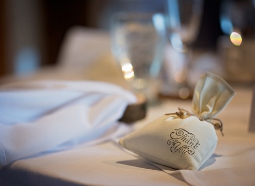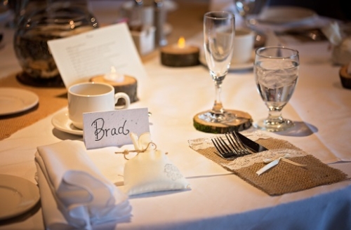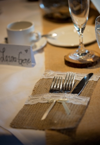 - The burlap cutlery holders with white lace are so fitting for a rustic wedding reception