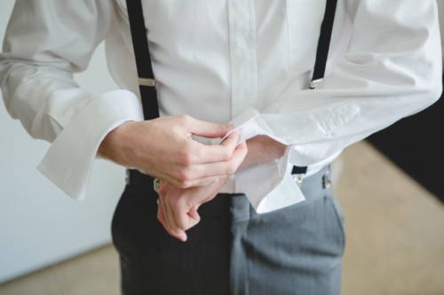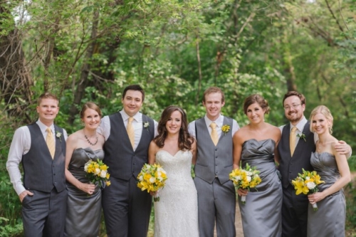 “The Groom wore light grey pants and vest from Derks. His tie was from Le Chateau. Cufflinks and watch were his grandpa’s. The groomsmen wore dark grey pants and vests from Derks and ties to match groom.”