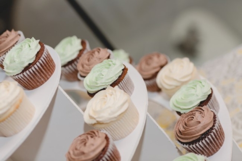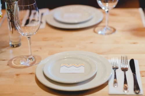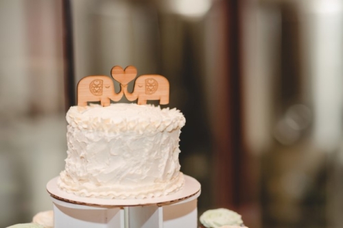 “For our decors, I bought table covers and made overlays for dessert/gift tables, and then mostly just added flowers around the brewery for decorations. Our wedding favors we gave to our guests were raspberry jam that grew from our own backyard! I bought this adorable wooden elephant cake topper from Cabin on Etsy”