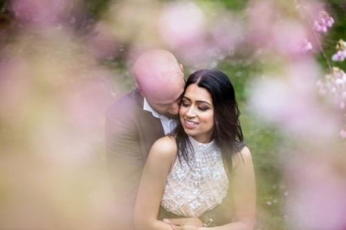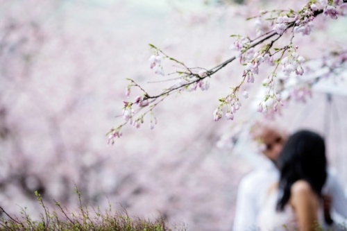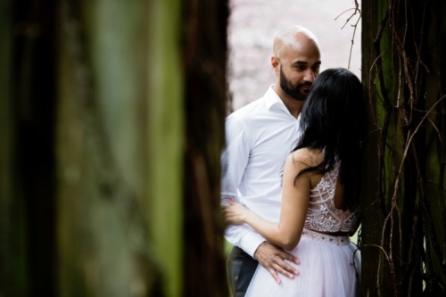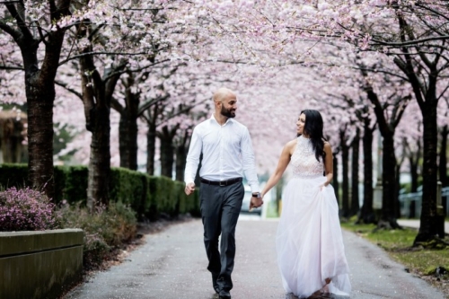 We don’t feature many engagement shoots these days, but simply had to make an exception for the very talented ladies from Karizma Photography out of our hometown Vancouver, Canada. We absolutely love the visually striking photography angles, refreshing and rainy cherry blossoms, and the cute couple in today’s engagement shoot! Photographer’s Remarks: “They say that falling in love is a lot like predicting the weather. You can have a good feeling but it won’t always be right. This certainly was not the forecast for Esma and Robby. Their Story “They met during their jobs when Rob, a police officer, came to Esma’s bank to investigate a fraudulent check. From there, sparks few and on December 24th, Esma awoke to the proposal she’d been waiting for. Engagement Shoot Idea “Since the proposal, they knew they wanted an engagement session that featured the incredible cherry blossoms in Vancouver. However, Mother Nature wasn’t going to make this easy for them. Historically speaking, this March was one of the gloomiest March months on record since 1951. That doesn’t make anyone’s life easy-especially not a photographer! Cherry Blossoms Galore “In response to this cold and wet weather, it was a gamble whether the cherry blossoms would be blooming when the shoot was scheduled since it had been planned so far in advance. Yet luck was on our side this day, and oh, how amazing these images turned out. It was still wet and rainy, but we captured all of the glory of this incredible and amazing place with cherry blossoms blooming in the background. “Esma and Rob had fun playing with the umbrella, snuggling under it to fend off the stray raindrops, and these two looked astounding with the glossy cement and the bright cherry blossoms. ‘Through wind and rain, love will endure’, and this is so true for Esma and Rob. These two are so happy to be together that they probably would have been just as amazing in the pouring rain, but this is a testament to their special bond and that they would literally stand through any element to be together.”