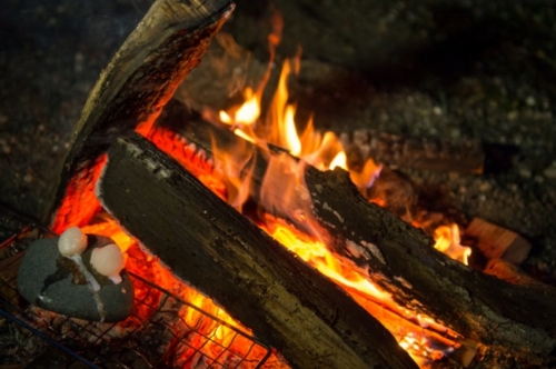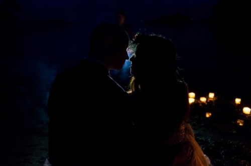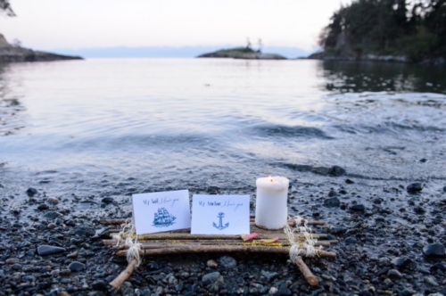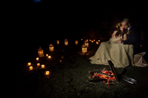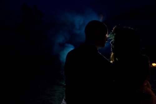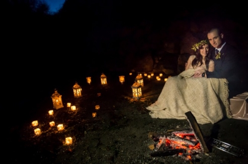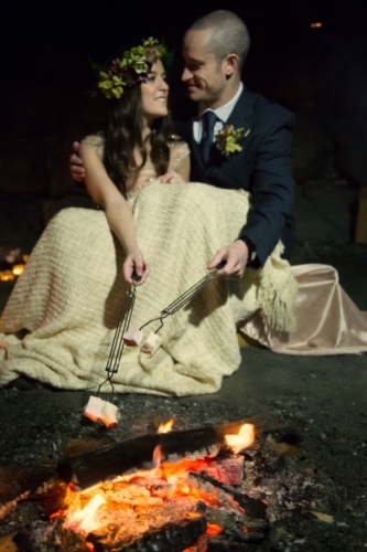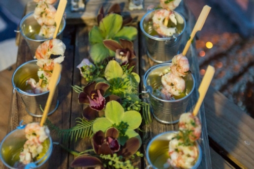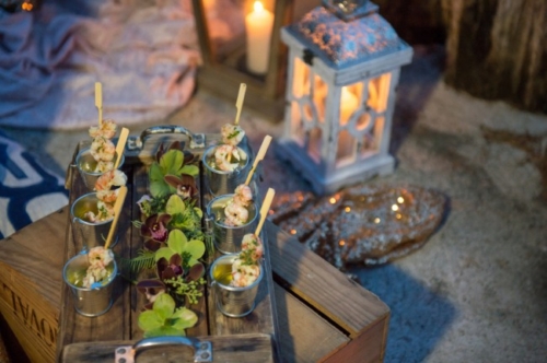 “Starting the photo shoot right on the beach, moving up to the driftwood deck and then back down to the beach to create a romantic beach-side fire, lit with just the amount of candlelight to create ambiance. Fresh seafood and handmade marshmallow s’mores were cooked right on the fire for our couple to feast and enjoy.”