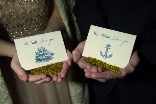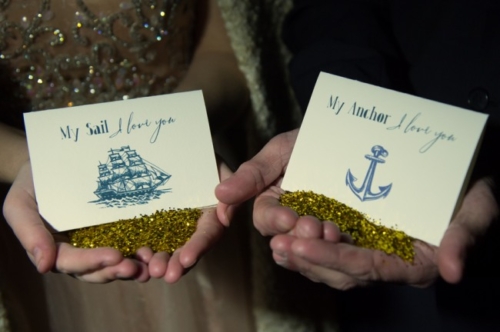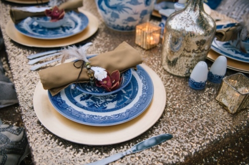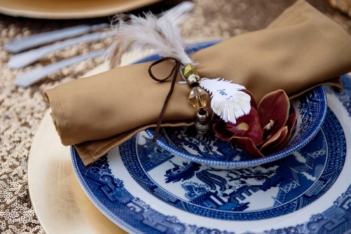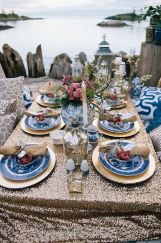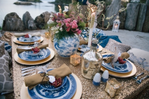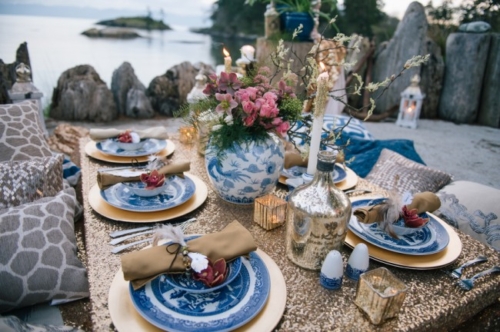 “Using a hand-crafted drift wood deck alongside the ocean, we created a haven of beauty using gold sequin overlays, runners and candlelight. Accents of royal blues in the pillows, the vintage heirloom vases added just the right touch of charm.