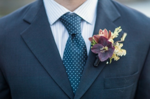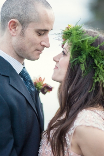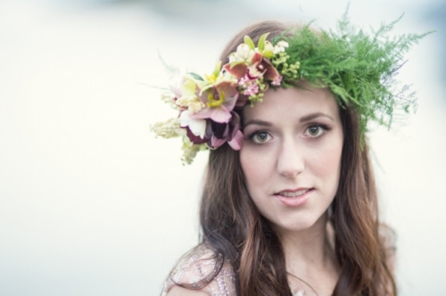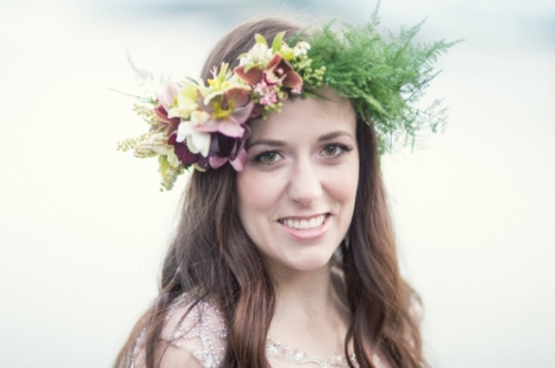 “The bride was dressed in a stunning, non-traditional gown in a blush tone, while the groom dressed in a navy blue suit. We dressed the bride with a floral crown consisting of locally grown hellobores in numerous colors, a few orchids with plumosa greens and pieris.