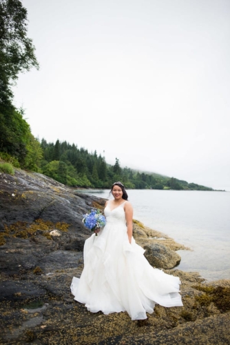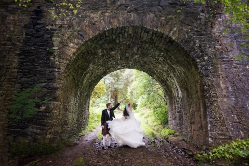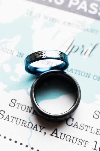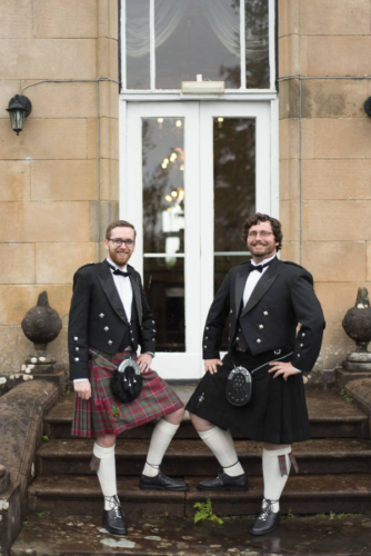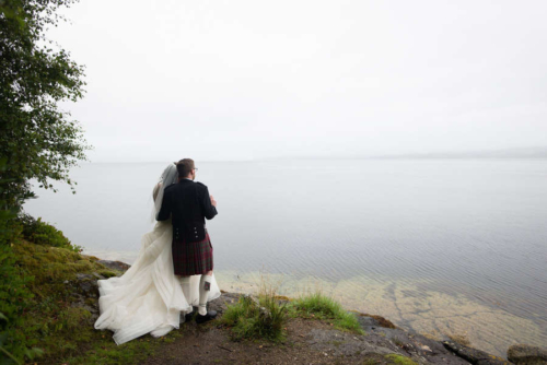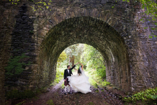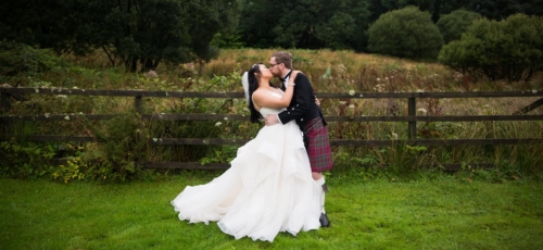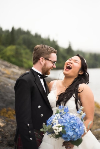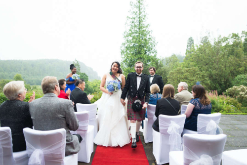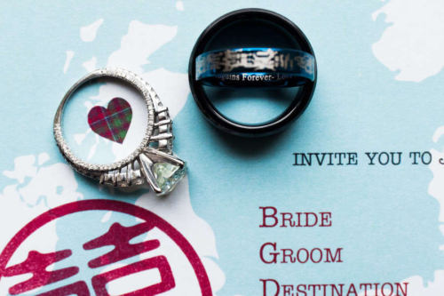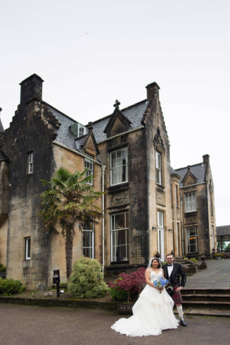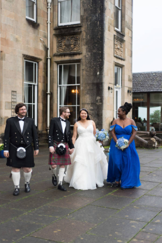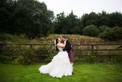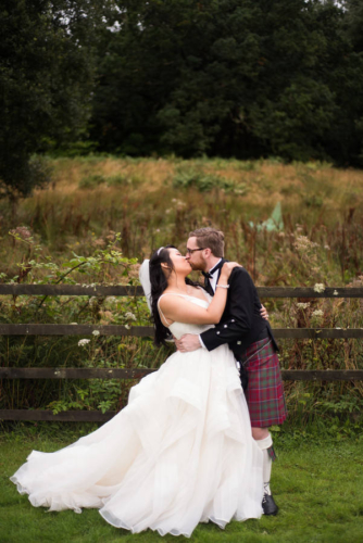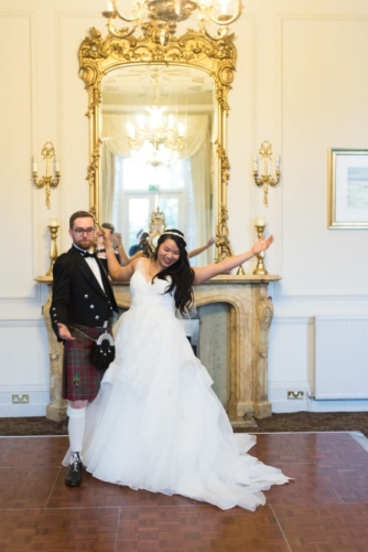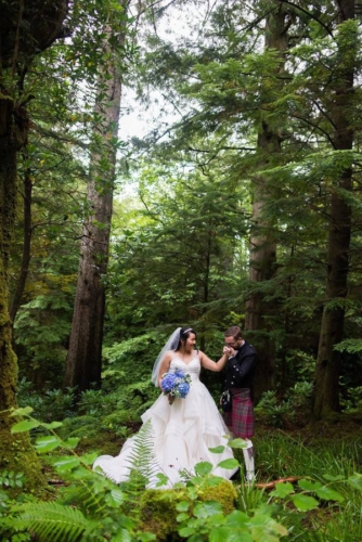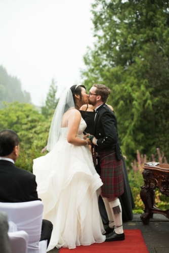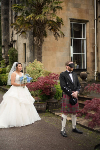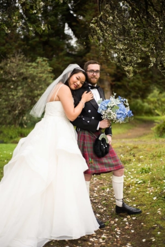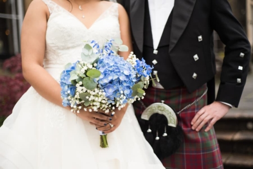 Q1: Tell us about your wedding! A1: “Stu has Scottish heritage from the Grant clan. He wore one of the Grant clan’s tartans for his kilt. We also did a modified handfasting ceremony, where a length of Stu’s tartan was wrapped around our hands after we said our vows. Red was an important part of our day because red is traditional in Chinese weddings, so my mother wore a red dress and I wore red lipstick. Coincidentally, the main color of Stu’s tartan was red, so that was a nice touch as well.” Q2: Let’s talk wedding decor A2: “We wanted the castle’s splendor to speak for itself, so we went very minimal with the decorations. There were white chair covers with white bows on the chairs; they were simple and beautiful. Other than the bows and some DIY centerpieces on the tables, we didn’t decorate the space at all.” Q3: What were the florals like in your wedding? A3: “The flower arrangements on the tables for the rehearsal dinner and reception were curated by our good friend Ross’s mother. Ross lives in Scotland, and his mum volunteered to help us with the flower centerpieces. She found lovely blue hydrangeas and large brandy vases for the arrangements and put them together herself.” “The flowers for my bridal bouquet and my Maid of Honor’s bouquet were hand-picked from the castle’s gardens on the morning of the ceremony. Stu and I both love the color blue, so it was important to us that we had blue flowers for our wedding. The blue hydrangeas were stunning and simple, just the way we wanted.” Q4: Did you personalize the day in any way? A4: “We played the scores to our favorite video games during the rehearsal dinner and during family portraits after the ceremony. I walked down the aisle to Vitamin String Quartet’s version of Cara Mia Addio from the video game Portal 2. Our first dance was to Vitamin String Quartet’s version of Still Alive from Portal. We loved having our favorite songs playing on our wedding day, and it was more meaningful because the songs came from games we love to play together. We also had Mr. and Mrs. Penguin cake toppers for our wedding cake, because we’ve always said we’re penguins because they mate for life.” Q5: Let’s talk fashion A5: “I wore a Truly Zac Posen for David’s Bridal dress. My dress has 3 tiers of horsehair-sculpted tulle for the skirt, with beaded lace appliques on the bodice. We also added a corset to the bodice to really fit the dress to my body. I had thought I wanted a dress completely different from what I wore, but the Zac Posen dress had my heart from the moment I saw it. I wanted to match the beaded floral lace appliques on the dress, so I picked a matching hairpiece and bracelet to complete the look. Underneath the tiers of my skirt, I wore very simple, two-strap royal blue heels for a pop of color that kept with our love of blue. “The moment we decided to have our wedding in Scotland, Stu knew that he wanted to wear a kilt. The Grant clan has a few different tartans for their clan, and we picked the “ancient muted” tartan. The muted red with blue and green accents really stood out on the day, especially with the greenery of Scotland as a backdrop. Stu wore a traditional Prince Charlie jacket, vest, tuxedo shirt with the kilt, as well as brogues and a formal sporran. He rather liked having a “man purse” to put things in on the day!” Q6: How did you meet? A6: “We met online and hit it off immediately. On our 2 year anniversary, Stu proposed to me on the front steps of our first house that we had bought together just the year before. He had told me we were going out for our anniversary dinner, and that there were art galleries and other places we could explore before our reservation. He kept trying to rush me out the door! As we were passing our front door to get to the garage to leave (or so I thought), he told me the wild neighborhood bunnies were out in our front yard. Naturally, I wanted to see the bunnies, so we went down our porch steps, just to have him drop to one knee and propose! One of Stu’s friends hid behind our fence and popped out to take proposal photos, so we have the moment documented forever.” Q7: What was the most anticipated or special moment of your wedding day? A7: “Our favorite part of the wedding was the first look. There was so much anticipation, and the moment is forever cemented in our minds. It felt like the world froze around us when he first saw me in my dress; it was like we were in our own little bubble of love. Stu looked so handsome in his kilt that it made me cry when I came up behind him, and when he took off the blindfold, he told me through tears how beautiful I looked. That’s something we’ll never forget.” Q8: Do you have any wedding planning or marriage advice to share with other couples planning their day? A8: “Our number one piece of advice is to do what you want to do! It’s YOUR day, and it should be exactly as you want it. Don’t let others dictate how your wedding should be, because they aren’t the bride and groom, you are. Couples also need great communication and respect! Wedding planning can be stressful, even if you think it won’t be, and the only way to survive is to be on the same team no matter what. Most of all, enjoy the day! Take a moment to soak it all in and remember it. The day passes by so fast, but it’s the best day of your life!”Gallery