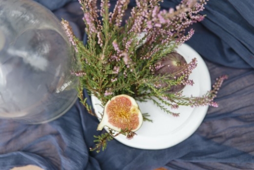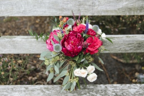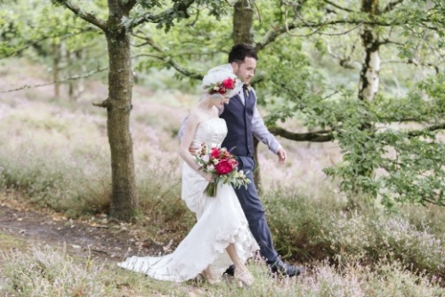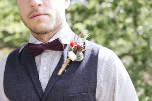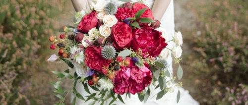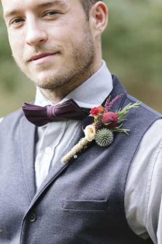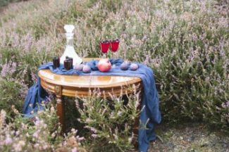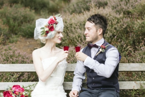 Purple heather fields together with brilliant red bouquet and veil accent provide a pop of color that really draw attention. While fresh figs and blackberries offer up a small scrumptious feast for the eyes.Who knew that a branch of ripening blackberries could integrate so well into a bridal bouquet!? I absolutely love the look.