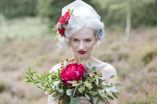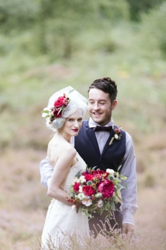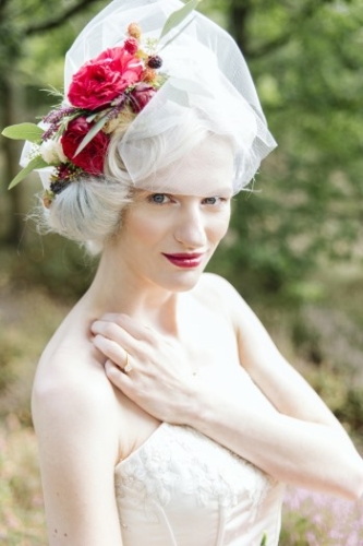 You can buy a similar birdcage veil, and then add your own red floral and blackberry accents similar to the one shown in this shoot.