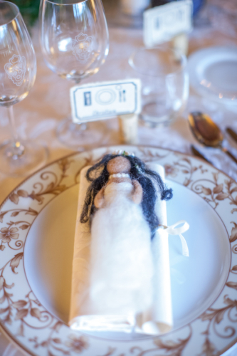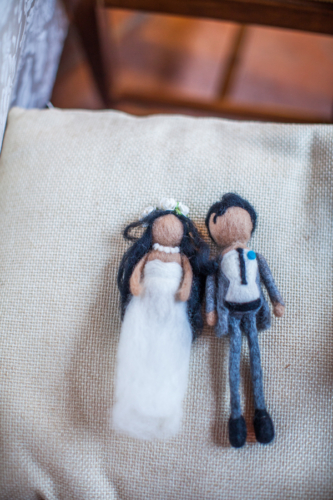 “DIY: We stamped our own dinner name cards and wrote in the names. The stamp and paper were from BHLDN. The stamp is from a company called Yellow Owl Workshop. I felted a mini bride and groom figurines of ourselves for table décor.”