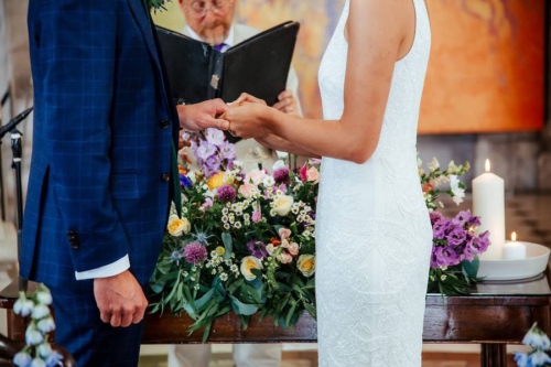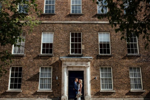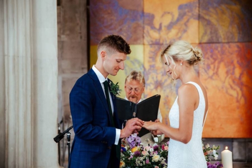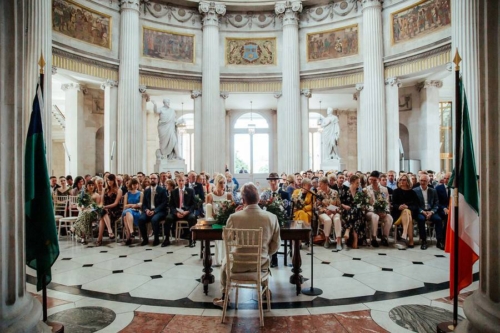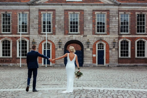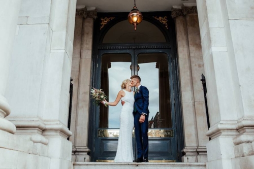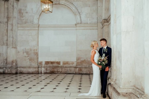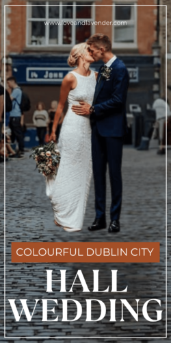 “Clare and Duncan dreamt of getting married in the iconic Dublin City Hall but it’s not so easy to find an available date there. They almost gave up and opted for a registry office wedding when suddenly the City Hall had a cancellation, and on a Saturday too! It really is in the heart of Dublin. If you want a wedding with city vibes you couldn’t pick a more impressive location. Surrounded by marble walls, columns and murals, it’s an especially elegant building. No more elegant than Claire herself though! Her Folkster Bridal gown fits her like a glove.