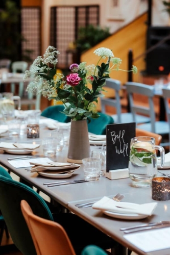 “An hour later, we ended up in Brother Hubbard on Capel Street, and the place looked absolutely transformed. It’s a bright and airy space filled with greenery and decorated with gilded Moroccan-style mirrors. The terrace is really inviting and was bustling with guests by the time we got in. The table decorations looked gorgeous. Having been to the restaurant for brunch on several occasions, I couldn’t imagine how they would fit almost 200 people for their first Brother Hubbard wedding. Yet they absolutely did! The place felt really spacious with the multiple windows and skylights. I hope Brother Hubbard becomes a new cool wedding venue in Dublin because I can’t wait to be back there!”