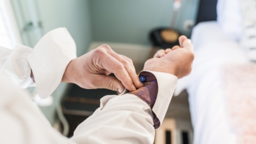 Gorgeous marbled dusty blue color wedding cake with elegant accents.