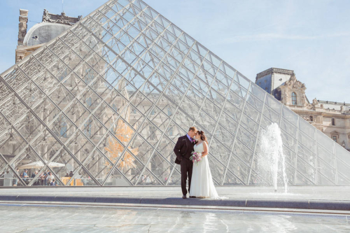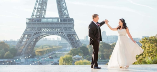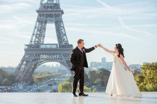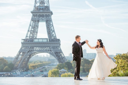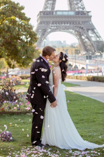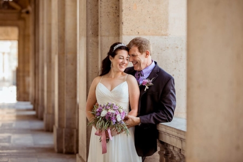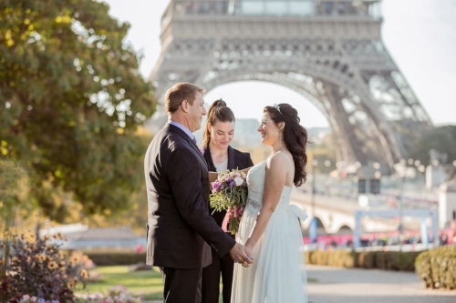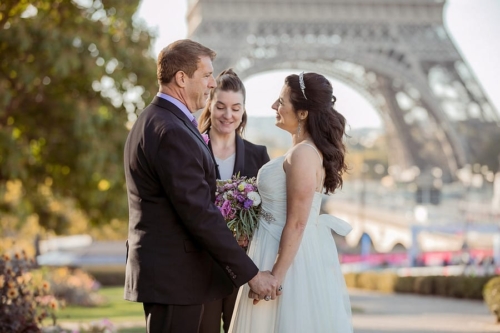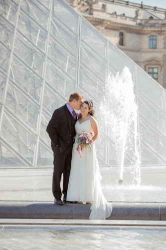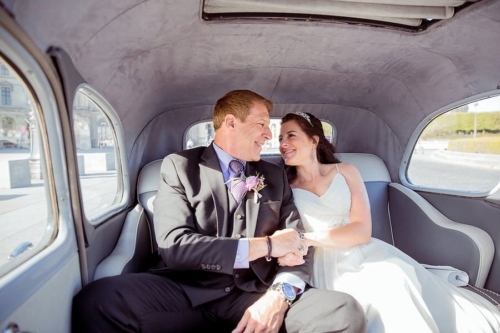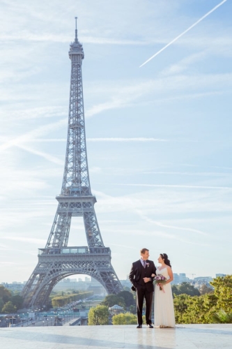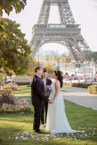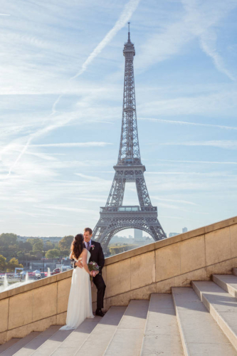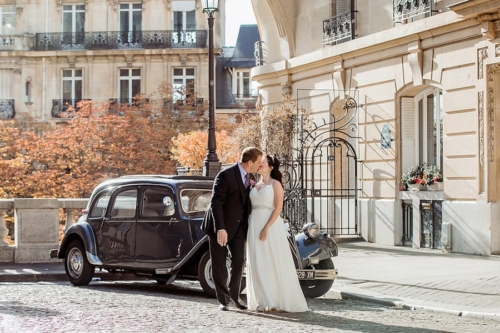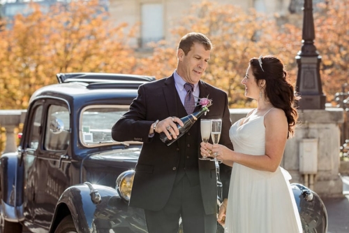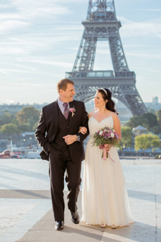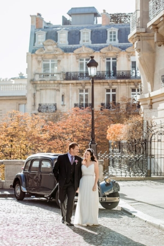 “Beth has always dreamed about Paris. She studied French in high school and always wanted to visit. So getting married there was a dream come true. They both wanted an intimate celebration of their love. They chose to have a celebrant ceremony at the Eiffel Tower to exchange their vows and to celebrate with a flower petal toss and champagne. Beth’s absolute favorite color is purple, so their elopement and to be purple color themed, which was mainly done trough outfits, wedding flowers and makeup. They also wanted to have a classic Parisian vintage touch, that’s were the classic French car, a Citroen Traction, came in.”