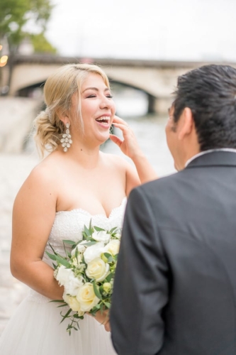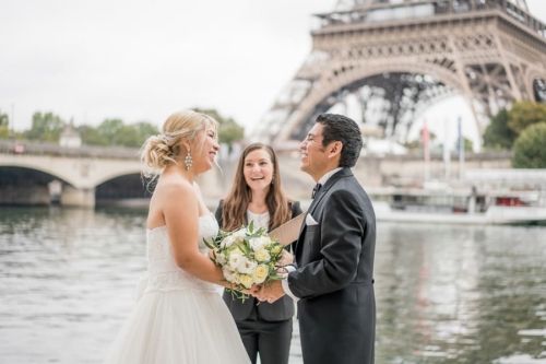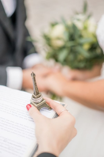 After she had changed we brought her to the Seine riverside at the Eiffel Tower. There The Paris Officiant was officiating Carlos & Teresa’s beautiful, personal and very romantic wedding ceremony. Carlos had also written some personal notes for Teresa, that he read to her during the ceremony – the tears of course started flowing.