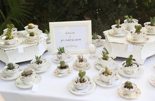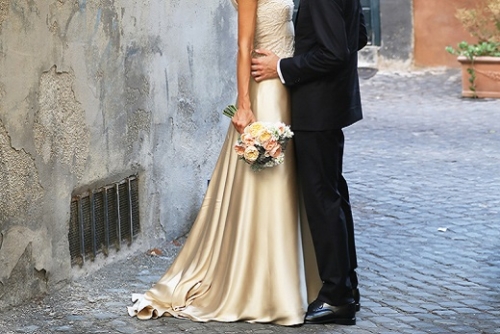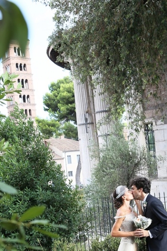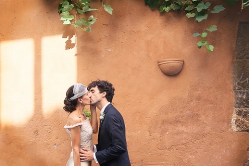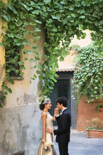 A beautiful couple featured in a simply divine wedding in Rome. We love the elegant decor and soft natural colors, in addition to the intimate back alley moments that scream, ‘Amore‘. From the Photographer “I love my job because it always gives me the opportunity to discover new places and to meet amazing people. Some of them are really special and let me tell you that Monica and Andrea are incredibly special. In this moment Andrea is in Angola, Africa to follow his natural need to help save children. At the same time, Monica lives in their home in Rome with a strength you can’t imagine. I know she is planning her first trip to Africa to meet her beloved husband. Unfortunately, they could meet only in April after 8 months far from each other.” From the Bride “Our wedding was intimate, sweet, and a little wild … matching our lifestyle and basic principles. We didn’t want a classy villa that Rome can offer, not even a formal reception; we deeply needed something that could speak for us. I remember we were thinking about a party in the evening, joyful moments to share with people we love most in a romantic atmosphere. We only needed to be happy all together and nothing more. “I knew about a nursery garden – a real oasis of peace in the center of Rome – that was the perfect place! We preferred an informal cocktail instead of a long and lazy dinner, but the most important thing was that we didn’t want a schedule for the evening. Our guests had to feel totally at ease on a warm summer night. They could saunter through the lush gardens, listening to background music from a group of young and talented musicians. Thanks to a wedding and floral design, the gardens were a beauty for the eyes, especially in the evening when many candles and threads of light illuminated the whole set up. it was magical!” ”We also tried to give importance to some elements of our wedding. For a DIY favor project we bought vintage tea cups in many antique local markets. I personally filled the cups with some tiny succulents, wrapped with a small tag with the sentence that held such meaning for Andrea and I, ‘Love is taking care’. “Our wedding planner found some ceramic soup bowls and cake stands for the bon-bon table that I thought were adorable. My father handmade a small ceramic dish as a ring pillow and also a simple cake topper that spelled out our initials with a copper thread. So sweet! “We asked our photographer to take some shoots in some of the most meaning places in Rome for us: Trastevere with its romantic alleys; Vesta Temple that is a symbol of the heart, and the Palatino Bridge. “When I think back to our wedding, I can’t stop thinking about the love we received from our friends and family, how deeply happy they all were for us, and that means everything to us!Gallery