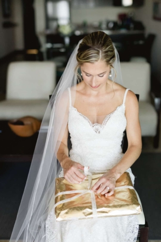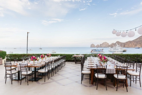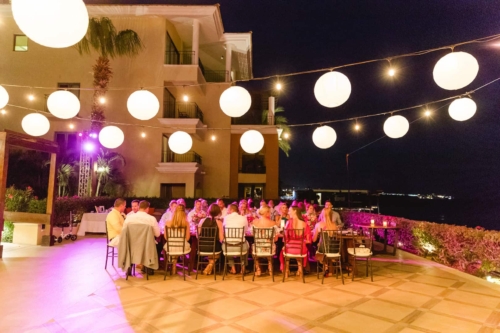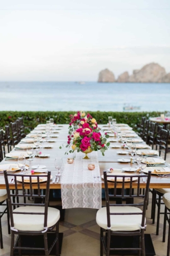 We started the weekend with a welcome party at the Baja Brewing Company located on the Cabo Villas Rooftop. Guests enjoyed beautiful views of Land’s End and noshed on tacos, margaritas, and beer! There was a live band playing on the rooftop, and it was the perfect way to kick things off. We opted to not have a wedding party because we just wanted our friends to come celebrate with us, and to have a fun, relaxing vacation. The next day, the ceremony began at 6pm on the terrace at Casa Dorada. Lyndsay walked down the isle in a lace Wtoo by Watters gown and chapel length veil to an acoustic version of ‘Sweet Child o’ Mine’ played by guitarist, Arturo Sotomayer. Arturo also played during the cocktail hour while guests enjoyed drinks and hors d’oeuvres, and we were able to sneak away to take some wedding portraits on the beach. The reception also took place on the terrace where we had two large tables decorated with lace runners and cream and pink roses in gold vases. After dinner, DJ Alex kept everyone on the dance floor until the party ended. The next morning we hosted a poolside brunch for everyone and hung out at the pool for the rest of the day! By having our wedding day on Friday, we were able to relax and spend time with family and friends all day Saturday before people started to travel back home on Sunday.