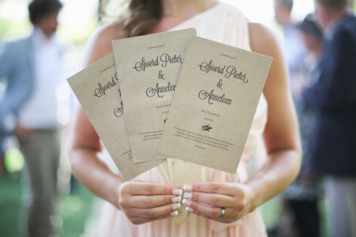 “The morning of the wedding we DIY’ed the entire wedding with pretty much all of the guests while Sjoerd Pieter and Anneleen tried to relax and prepare for their big day. We cut the ribbons and made the arch, I arranged the flowers, the bouquet and the boutonnière for the groom. We wrote the escort cards, created a special nook for the guestbook (atlas envelopes where guests could put a note in) and created the atmosphere that we wanted – relaxed and casual with a few vintage details.“