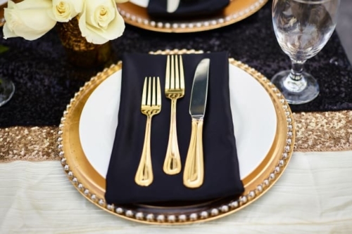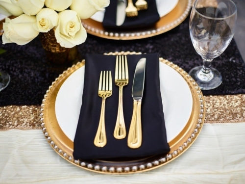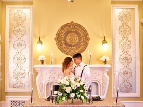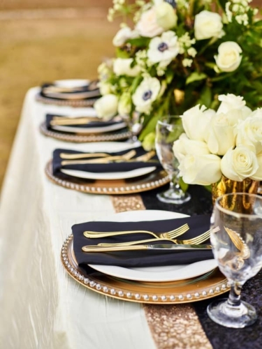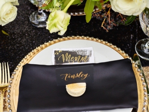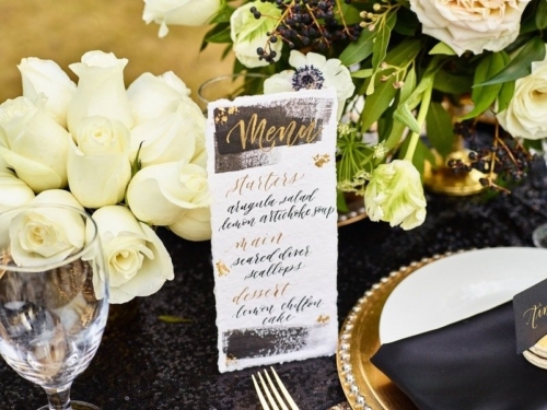 Photographer’s Comments: “Telling the story of love can be a beautiful thing especially when it’s decorated with Ivory & Gold table décor accented with white floral designs by LZfloral & elegant calligraphy dinner menus by Yellow Rose Calligraphy.
