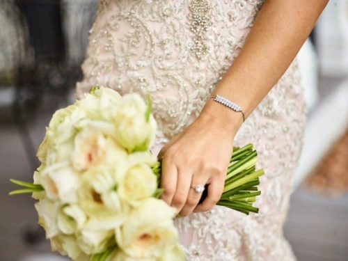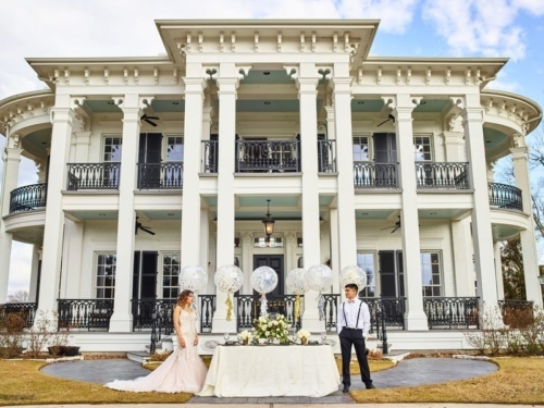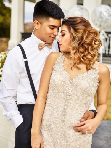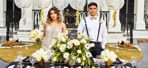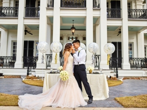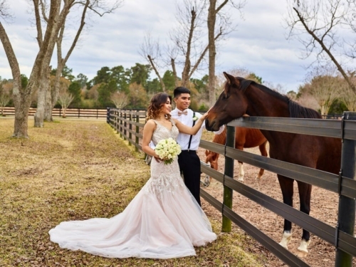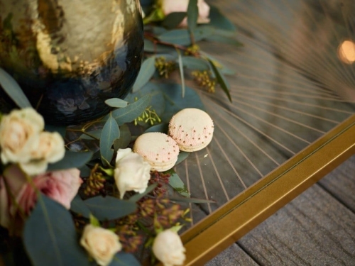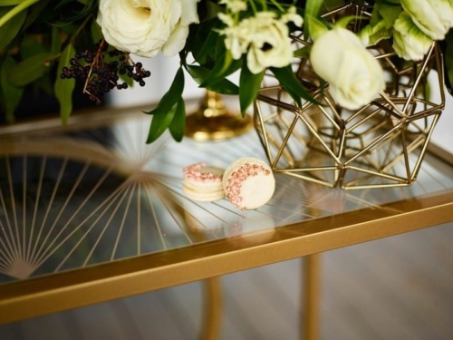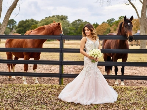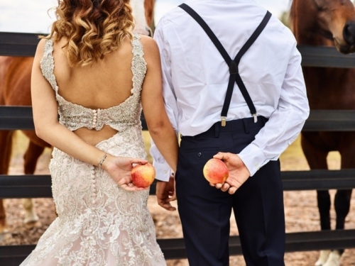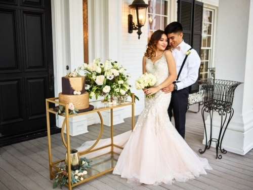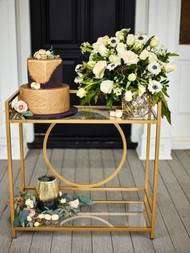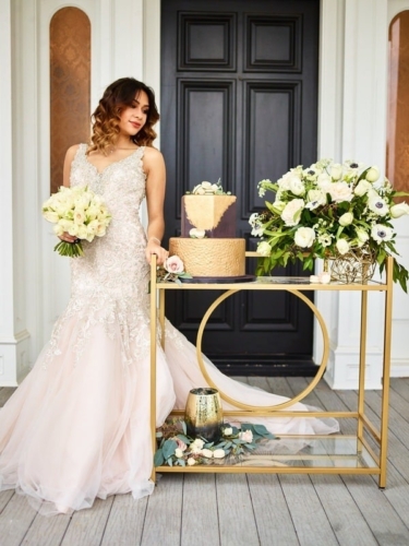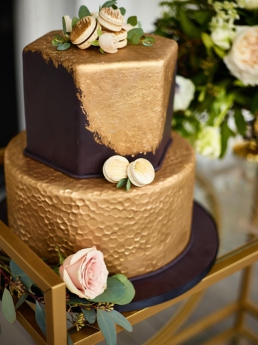 “The addition of Joey with a golden bowtie & Jasmine with a gorgeous Madison James bridal gown to this scene creates a timeless love memory. The couple next enjoyed styling by the golden cake design of Cakes by Gina and the artsy desserts of Heritage Macrons on the balcony. Afterwards an instant classic memory was made during the beautiful seconds spent with horses Zoey & Zeva.