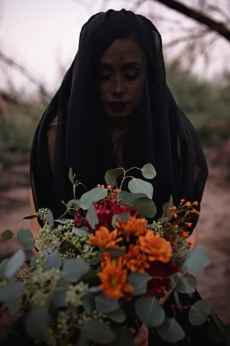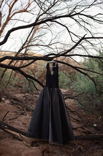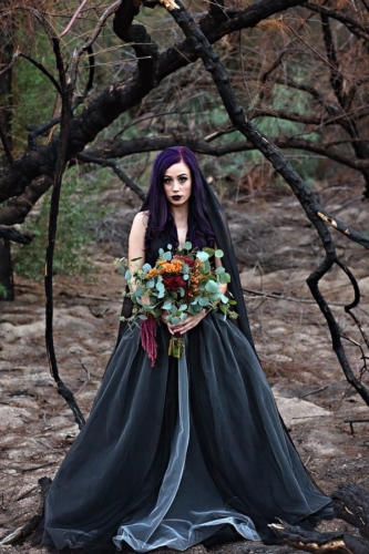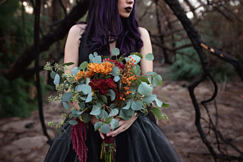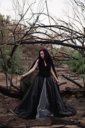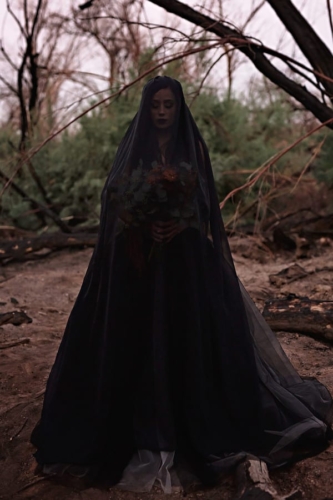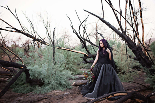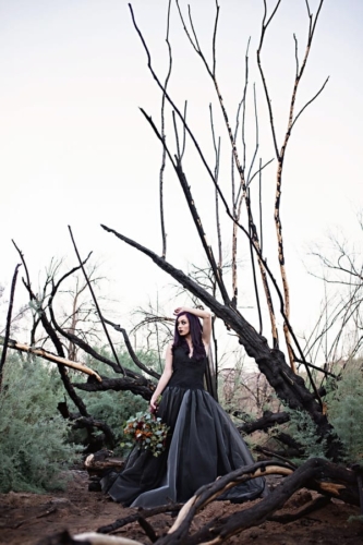 “A Halloween inspired Dark Bridal shoot at the Burned Trees of the Salt River. A wildfire scorched the trees of the Tonto Nation Forest near the banks of the Salt River in the Arizona desert. It was the perfect backdrop for this Halloween inspired dark bridal shoot.