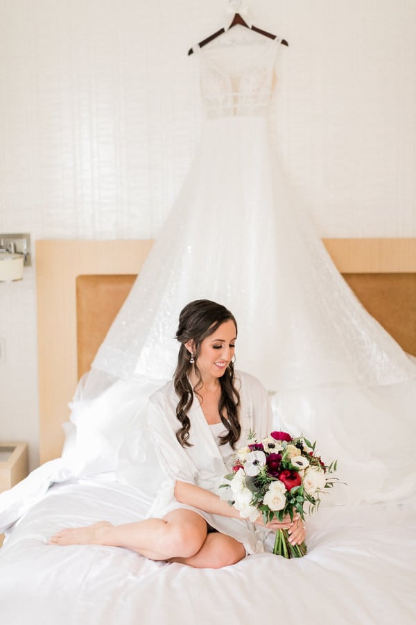 Photographer’s Comments: “A classy winter wedding with epic NYC skyline views. Stunning wedding dress with touches of burgundy in the florals. Sparkly details and a downtown feel.”