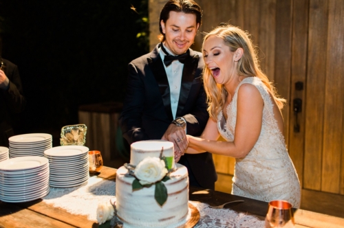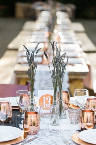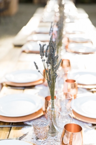 In order to complement the strong presence of copper, Alyssa chose to keep floral arrangements to a minimum so as not to compete with the boldness of this metal. With a strong affinity for lavender, this delicate flower emerged as a perfect counterpoint. Sprigs of locally sourced lavender were made into small arrangements and placed in mismatched apothecary vessels that were sprinkled among mercury glass votives on each table. Lavender was further incorporated into the bridal bouquet, placed upon the wedding cake, and lay adorning the bar.