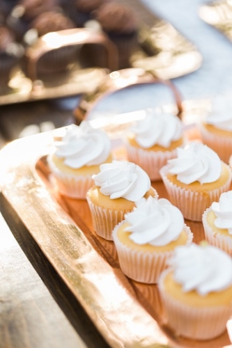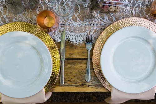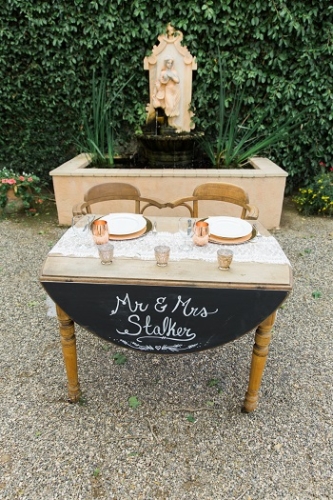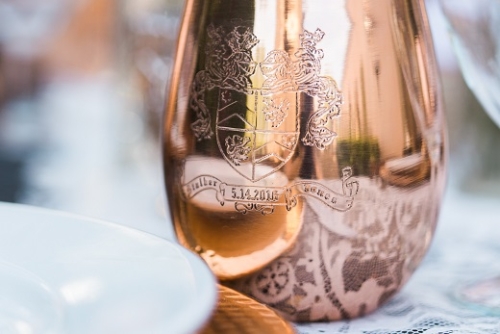We continue to see copper increasing in popularity as a main metal for wedding decor. Copper also happens to be the foundation of Alyssa and Eric’s business – Copper Mug Co. Specializing in drink-ware, Alyssa and Eric provided each guest with a stemless copper cup favor for wine, each engraved with a custom logo (combined family crest) designed by the groom himself. Additionally, the bride and groom handcrafted hammered copper chargers, copper cupcake trays to tie in the dessert bar, and incorporated hints of copper throughout signage and the bar to carry the theme through all elements of the evening. Â