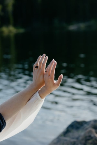 We spent the hike there and back stopping at various locations for photos. Once we arrived at the lake, the sweet couple read cards from family members and then had a sweet vow ceremony in the golden sunset light.