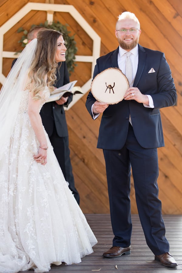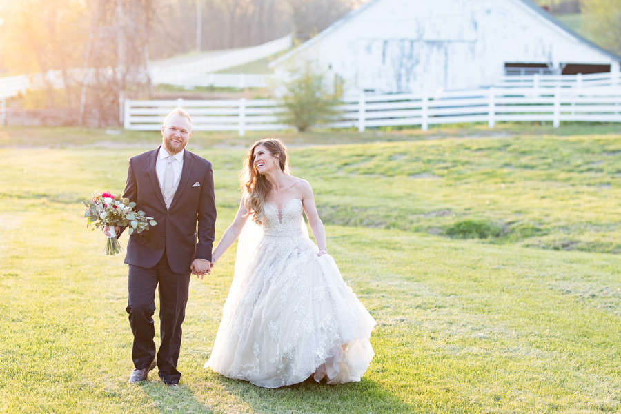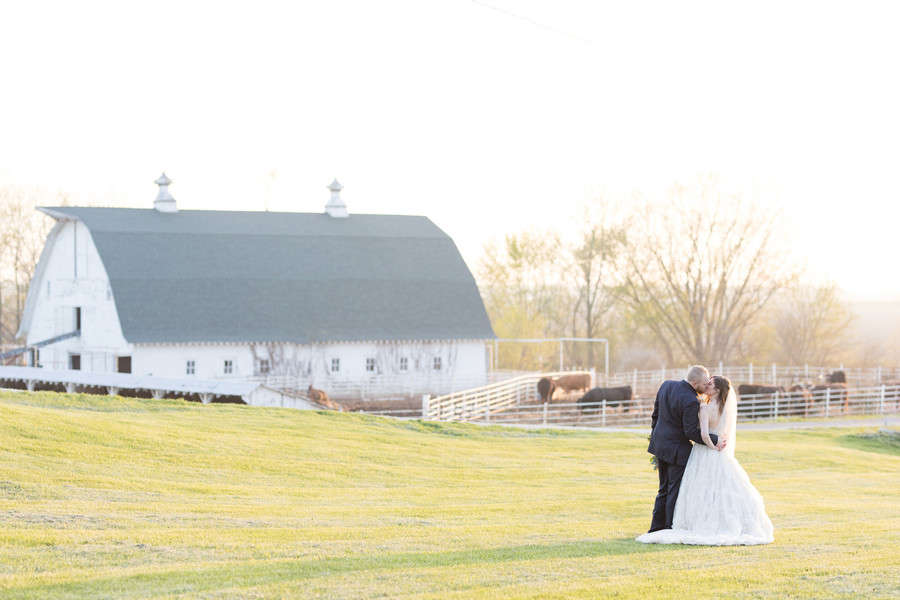 Photographer’s Comments: “Amanda and Charley chose a brand new venue at a real working farm in Missouri. They picked this venue because of it’s hilltop view and because they fell in love with the owners of the venue – Art and Christie, who opened the venue because they felt like God was leading them to do this so they could truly serve their couples and celebrate marriage. The owners live and work on the farm, in addition to operating the venue themselves! “Amanda’s grandmother was unable to make it to the ceremony, but really wanted to make sure she celebrated and rejoiced with them. During the ceremony, the pastor played a recorded prayer from her grandmother praying over them for their marriage, which had everyone in tears (including the photographer). “The couple decided to do a branding during their ceremony instead of a traditional unity candle. They had a custom branding iron made ahead of time (that Charley designed), which was heated up and brought over by Charley’s dad at the moment they branded a piece of wood. Amanda grew up with her dad raising cattle and they loved the idea of this. This brand also carried into the topper for the cake during the reception. “Amanda and Charley met when Charley purchased a gun from her at the Bass Pro counter. After meeting her, he actually applied for a job there so he could “flirt with her and make her fall in love with me”. Their first date was watching game 5 of the Royals world series in 2015 when the Royals won it all! Amanda actually purchased a rifle for Charley as a gift at the wedding. She wanted him to have a generational gift he could pass on to their children.”Gallery