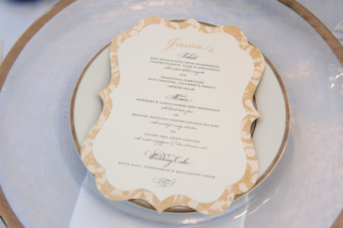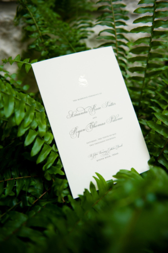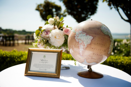 Remarks from the bride: “For our guest book we used a globe because we were in a long distance relationship for 4 years before finally moving down here to Austin in January 2014. We thought a globe was a good way to tie together all of our MANY travels together.” “For our reception we wanted the overall feeling to be romantic, light and upbeat.  The cocktail hour we had a fun blue grass band play, while guests enjoyed cornhole/bags games on the lawn and enjoying the afternoon sun.  Dinner followed cocktail hour and was more formal with one long dinner table under a beautifully decorated white tent.” “We used a picture of a plane for our seating chart because of our long distance relationship and the travel we had to do to see each other.”