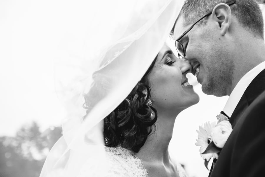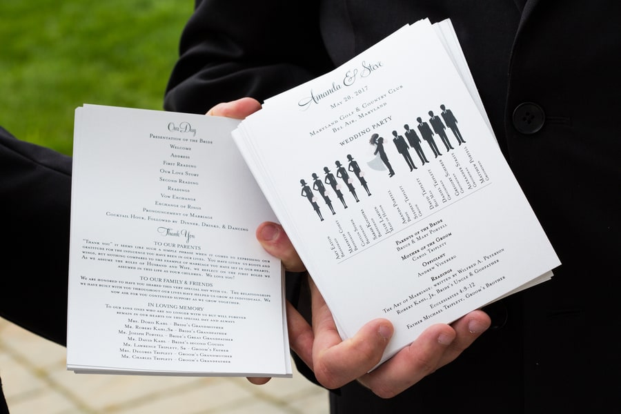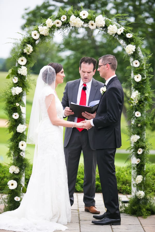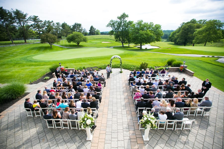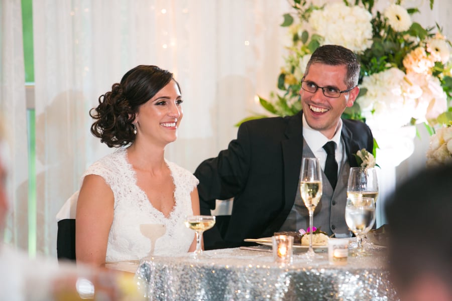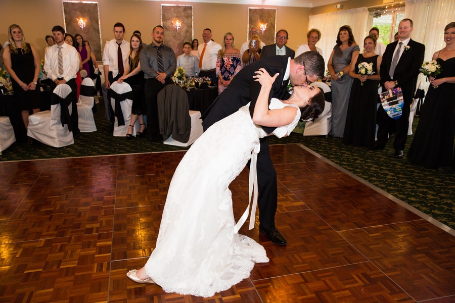 Bride’s Comments: “When we started planning out big day we knew we wanted it to be classic with a modern element. We just didn’t want to look back on our special day and cringe. In order to achieve this classic style, we chose a color palette of black and white with a silver accent, which really complimented the greens from the golf course. “We also included some hints of a golf theme with the favors and seating card table, and a few photos since my husband loves golf.”About This Wedding