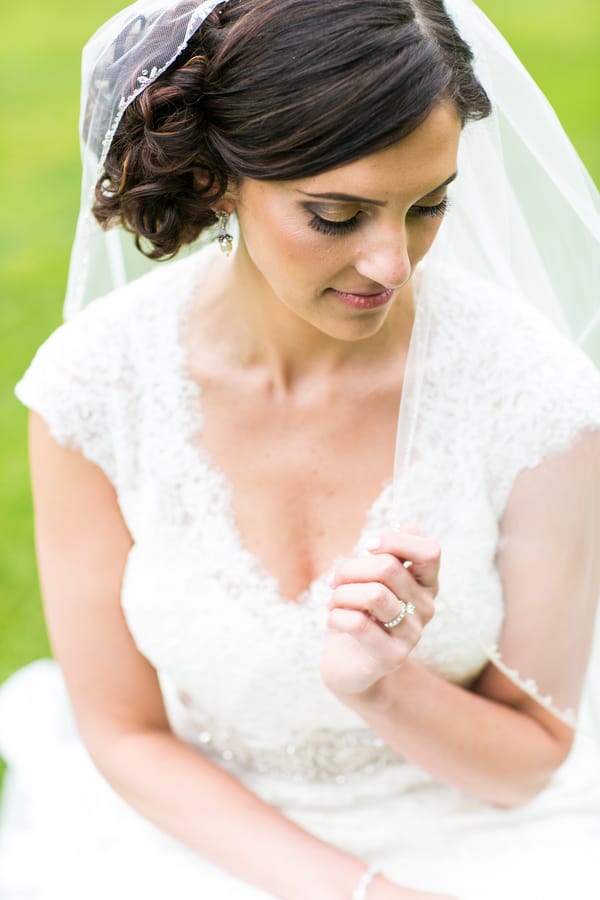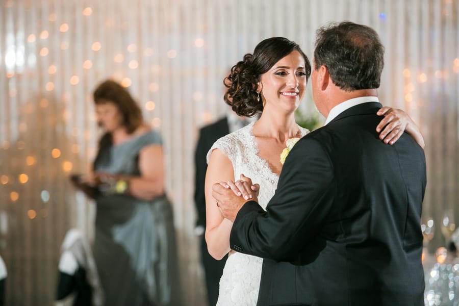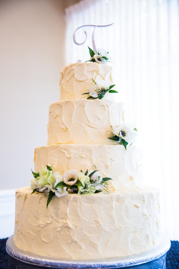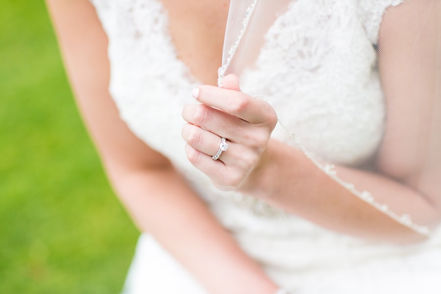 Q: Let’s talk wedding decor “To play off our color platte, we used black linens on the guest tables that were decorated with silver votives and small floral arrangements. Steve and I had a sweetheart table that was covered in a silver sequin linen, which really looked great in the dining space. “To decorate the remaining space, we included a light up LOVE sign on the bar, silver picture frames with family wedding photos on the gift table, and a box for marriage advice. “By far our most creative and DIY (with help from our venue) decor was the seating card table. We had a large wooden box built then added a large piece of sod/grass. Our seating cards were placed in golf tees then stuck in the grass. It really surprised everyone and was something unique, plus my husband is a golfer and it went with our venue.” Q: What were the florals like in your wedding? “Once I laid my eyes on a white anemone with a black center, that is all I wanted. I had to have this flower! It did not matter what else was in the florals as long as anemones were in there. “These were included in the bridal bouquet along with cream peonies, lisianthus, white ranunculus, and accenting dusty miller. The bridesmaids had a smaller bouquet with garden roses and white gerbera daisies with black centers accented again with dusty miller. “The ceremony site, outside patio, was decorated with two white columns holding a large bridal arrangment of cream and white flowers and an white lattice arch decorated with a garland and accented with bridal flowers. “Guest tables at the reception site had elegant centerpieces with similar white and cream flowers in the bridal bouquets. We added a modern element by having rose bowls of black river rock with water and a floating white gerbera daisy on the cocktail tables. Q: Did you personalize the day in any way (food trucks, guest entertainment etc.)? “We had a lot of personalization, whether our guests knew it or not. The more obvious items included ‘Amanda & Steve’ with our wedding date on some of the votives used to decorate guest tables and our names in the ice sculpture during cocktail hour. It was really fun to have these large cut photos of us as kids to enter in the reception and our guests could use in the Photo Booth. “Less obvious items included having a grilled cheese and shot glass of tomato soup as one of our appetizers, which is Steve’s favorite food. “We also love bloody marys so our guest favors were bloody mary kits that had cups with our names, Mr. & Mrs. T bloody mary mix (my new last name starts with a T ), and Titos vodka. “The most meaningful element we incorporated was three tiny picture frames with my grandmother, my grandfather, and Steve’s dad, all who are no longer with us, on the bridal bouquet. I also ironed on a little note to Steve on the back of his tie and also another note on the back of my dad’s tie. Don’t want to forget the bourbon and cigar bar either! That was a hit!” Q: Let’s talk fashion “I wanted to wear something that I would like ten years from now so I stayed away (but had fun trying on) some more trendy dresses. I tried on a different dress but incorporated this crystal detailed belt and became obsessed with the belt. I don’t even wear belts! Once I had my heart set on the belt, I finally found a beautiful Maggie Sottero lace dress with had cap sleeves and a key hole back…which went together perfectly with my belt and made me feel like a bride. It gave me the classic look I wanted, but was shape flattering and surprisingly comfortable. “Steve chose his wedding day look as I’m sure most grooms do…with heavy recommendations from the bride! He wanted to be different than the groomsmen so after a lot of trying on suits, 3 purchased vests, and 2 ties, we settled on a black suit, grey vest, black tie, white dress shirt, and of course statement socks. He looked good!” Q: How did you meet? “We met working for the same accounting firm. Steve was friends with one of our groomsmen who was assigned to showing me around when I was new. We all would go to lunch and hang out so Steve and I became friends first and after two years (and some pushing from two of the groomsmen) we started dating.After a romantic dinner on the beach in Aruba, Steve handed me his cell phone to show me a picture as we walked back to our hotel on the beach. The picture was a selfie with him holding the ring. Once I looked up, shocked, he was down on one knee. It was such a special moment! Q: What was the most anticipated or special moment of your wedding day? “The first look was the most anticipated moment of the wedding. It was a strange feeling to not be together in the morning during such a eventful day. Finally when we saw each other, I instantly felt a rush of emotions. I was happy, relieved, and felt comforted knowing that my partner in crime was here with me and everything would work out. “I was most nervous about our first dance since we took 5 weeks of dance lessons. It ended up turning out great…I think mostly because everyone was shocked at Steve’s moves so they weren’t watching me.” Q: Do you have any wedding planning or marriage advice that you’d like to share with other couples planning their day? “Stay organized. Have fun and enjoy it! This is the only time you will ever get to do this so try on the dress you know you’d never wear, eat all cake flavors, and remember why you are doing it all in the first place. Everyone says the day goes by so fast and it really does. “If something doesn’t go the way you planned, don’t stress. Your guests don’t know what you had planned so they don’t know what they are missing. In fifteen years no one will remember the small stuff-just how they felt that day.”Gallery