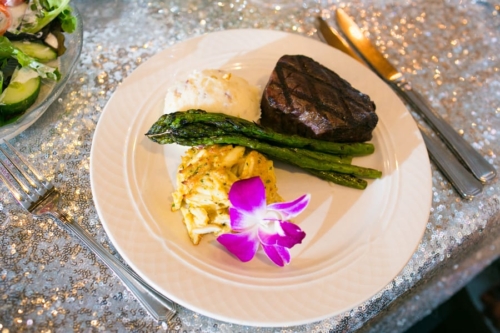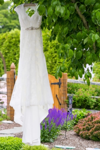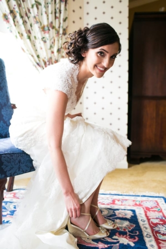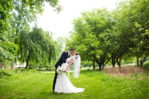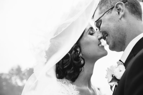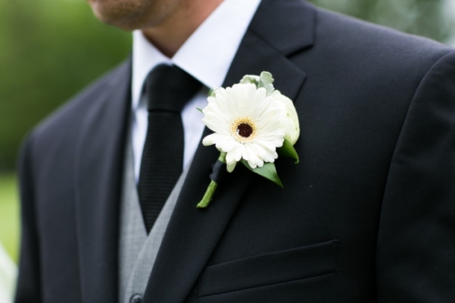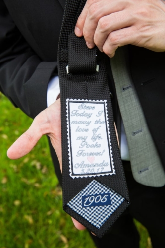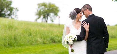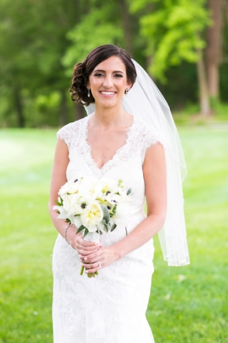 Q: Let’s talk wedding decor “To play off our color platte, we used black linens on the guest tables that were decorated with silver votives and small floral arrangements.  Steve and I had a sweetheart table that was covered in a silver sequin linen, which really looked great in the dining space. “To decorate the remaining space, we included a light up LOVE sign on the bar, silver picture frames with family wedding photos on the gift table, and a box for marriage advice. “By far our most creative and DIY (with help from our venue) decor was the seating card table.  We had a large wooden box built then added a large piece of sod/grass.  Our seating cards were placed in golf tees then stuck in the grass.  It really surprised everyone and was something unique, plus my husband is a golfer and it went with our venue.” Q: What were the florals like in your wedding? “Once I laid my eyes on a white anemone with a black center, that is all I wanted.  I had to have this flower!  It did not matter what else was in the florals as long as anemones were in there. “These were included in the bridal bouquet along with cream peonies, lisianthus, white ranunculus, and accenting dusty miller.  The bridesmaids had a smaller bouquet with garden roses and white gerbera daisies with black centers accented again with dusty miller. “The ceremony site, outside patio, was decorated with two white columns holding a large bridal arrangment of cream and white flowers and an white lattice arch decorated with a garland and accented with bridal flowers. “Guest tables at the reception site had elegant centerpieces with similar white and cream flowers in the bridal bouquets. We added a modern element by having rose bowls of black river rock with water and a floating white gerbera daisy on the cocktail tables. Q: Did you personalize the day in any way (food trucks, guest entertainment etc.)? “We had a lot of personalization, whether our guests knew it or not.  The more obvious items included ‘Amanda & Steve’ with our wedding date on some of the votives used to decorate guest tables and our names in the ice sculpture during cocktail hour.  It was really fun to have these large cut photos of us as kids to enter in the reception and our guests could use in the Photo Booth. “Less obvious items included having a grilled cheese and shot glass of tomato soup as one of our appetizers, which is Steve’s favorite food. “We also love bloody marys so our guest favors were bloody mary kits that had cups with our names, Mr. & Mrs. T bloody mary mix (my new last name starts with a T ), and Titos vodka. “The most meaningful element we incorporated was three tiny picture frames with  my grandmother, my grandfather, and Steve’s dad, all who are no longer with us, on the bridal bouquet.  I also ironed on a little note to Steve on the back of his tie and also another note on the back of my dad’s tie.  Don’t want to forget the bourbon and cigar bar either!  That was a hit!” Q: Let’s talk fashion “I wanted to wear something that I would like ten years from now so I stayed away (but had fun trying on) some more trendy dresses.  I tried on a different dress but incorporated this crystal detailed belt and became obsessed with the belt.  I don’t even wear belts!  Once I had my heart set on the belt, I finally found a beautiful Maggie Sottero lace dress with had cap sleeves and a key hole back…which went together perfectly with my belt and made me feel like a bride. It gave me the classic look I wanted, but was shape flattering and surprisingly comfortable. “Steve chose his wedding day look as I’m sure most grooms do…with heavy recommendations from the bride!  He wanted to be different than the groomsmen so after a lot of trying on suits, 3 purchased vests, and 2 ties, we settled on a black suit, grey vest, black tie, white dress shirt, and of course statement socks. He looked good!” Q: How did you meet? “We met working for the same accounting firm.  Steve was friends with one of our groomsmen who was assigned to showing me around when I was new.  We all would go to lunch and hang out so Steve and I became friends first and after two years (and some pushing from two of the groomsmen) we started dating.After a romantic dinner on the beach in Aruba, Steve handed me his cell phone to show me a picture as we walked back to our hotel on the beach.  The picture was a selfie with him holding the ring.  Once I looked up, shocked, he was down on one knee.  It was such a special moment! Q: What was the most anticipated or special moment of your wedding day? “The first look was the most anticipated moment of the wedding.  It was a strange feeling to not be together in the morning during such a eventful day.  Finally when we saw each other, I instantly felt a rush of emotions.  I was happy, relieved, and felt comforted knowing that my partner in crime was here with me and everything would work out. “I was most nervous about our first dance since we took 5 weeks of dance lessons.  It ended up turning out great…I think mostly because everyone was shocked at Steve’s moves so they weren’t watching me.” Q: Do you have any wedding planning or marriage advice that you’d like to share with other couples planning their day? “Stay organized. Have fun and enjoy it!  This is the only time you will ever get to do this so try on the dress you know you’d never wear, eat all cake flavors, and remember why you are doing it all in the first place.  Everyone says the day goes by so fast and it really does. “If something doesn’t go the way you planned, don’t stress.  Your guests don’t know what you had planned so they don’t know what they are missing. In fifteen years no one will remember the small stuff-just how they felt that day.”Gallery