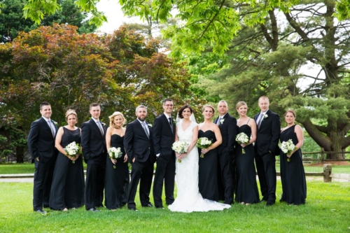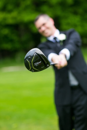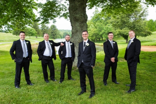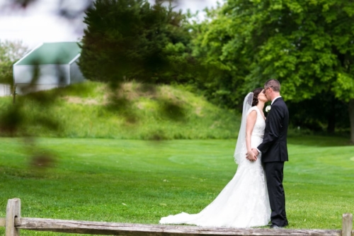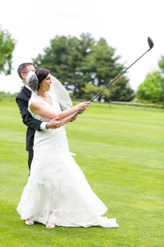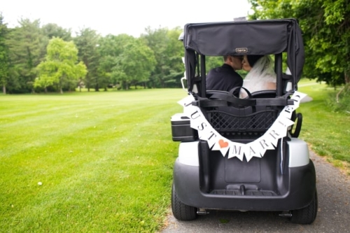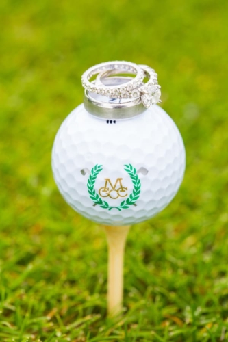 Bride’s Comments: “When we started planning out big day we knew we wanted it to be classic with a modern element. We just didn’t want to look back on our special day and cringe. In order to achieve this classic style, we chose a color palette of black and white with a silver accent, which really complimented the greens from the golf course. “We also included some hints of a golf theme with the favors and seating card table, and a few photos since my husband loves golf.”About This Wedding