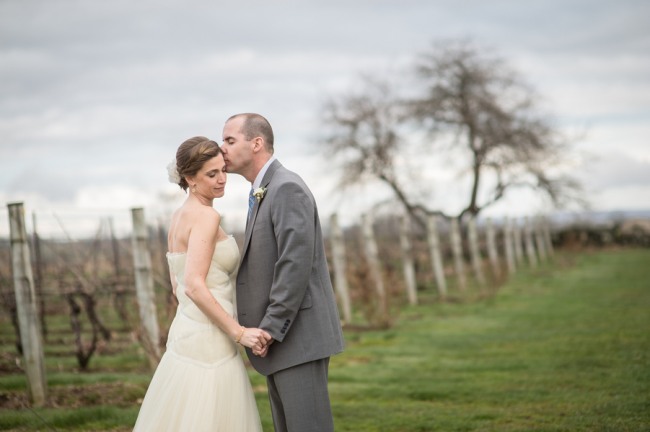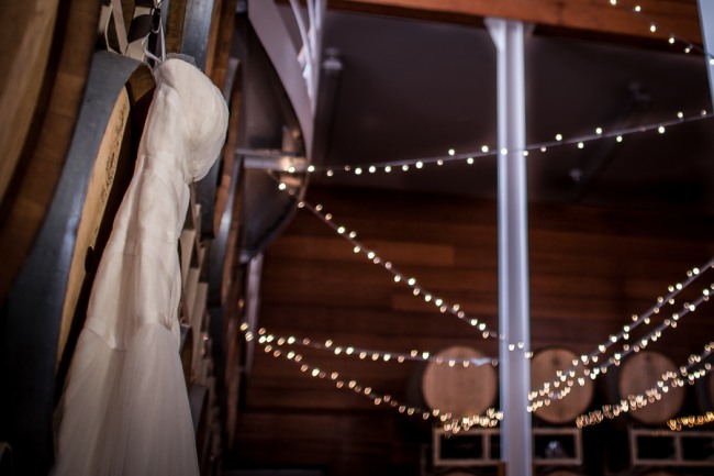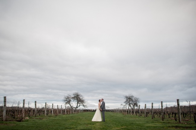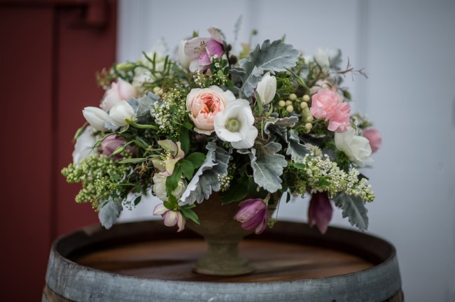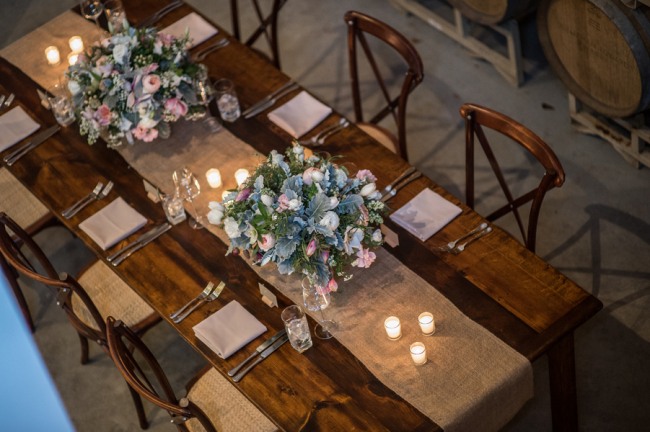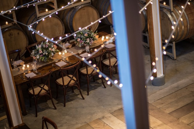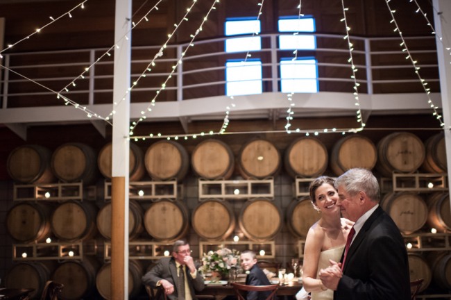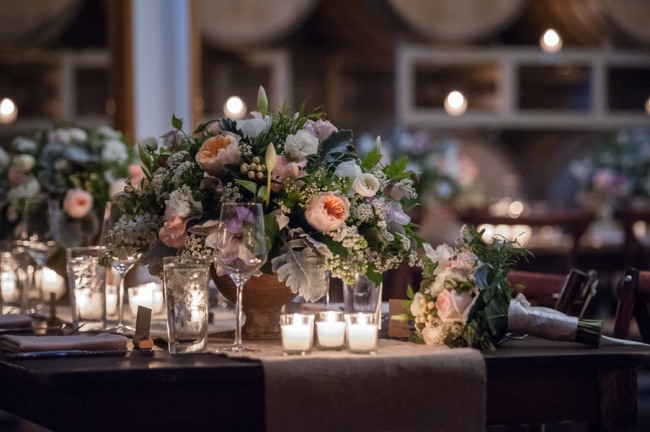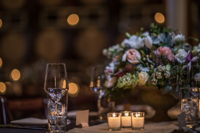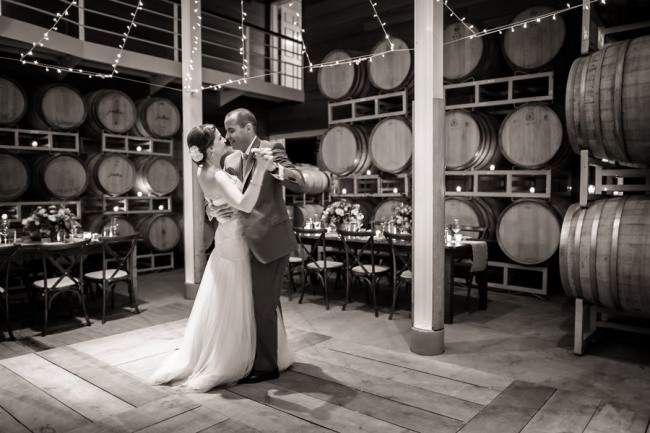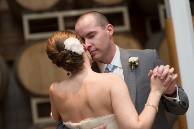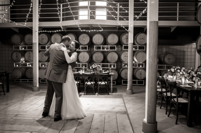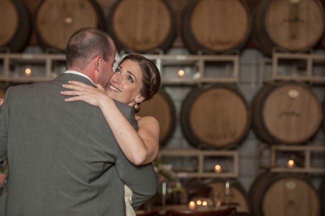 For a small and intimate wedding there is no better room than a barrel room at a winery. The beautiful reception at Jonathan Edwards winery had the perfect ambiance: dim lighting, high ceilings, twinkling light above, and a feature wall of barrels as a focal point. Add small touches of burlap, candle light, cork place name holders, a wood dance floor and some beautiful floral center pieces of creams, ivories and peaches, and you have yourself the perfect intimate and elegant evening.