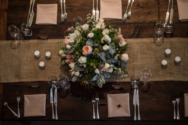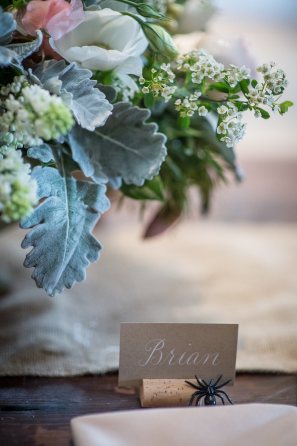 “One of the fun details that was included was plastic spiders at Brian’s place setting. This is an inside joke between Amy’s daughter, Maggie, and her new step dad, who like to hide plastic spiders inside each others pockets and shoes.”