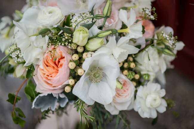 “Amazing work by Hana Floral in Mystic, CT. A variety of cream and peachy roses, ranunculus, lilac, tulips, peonies, and gorgeous greens and herbs.”