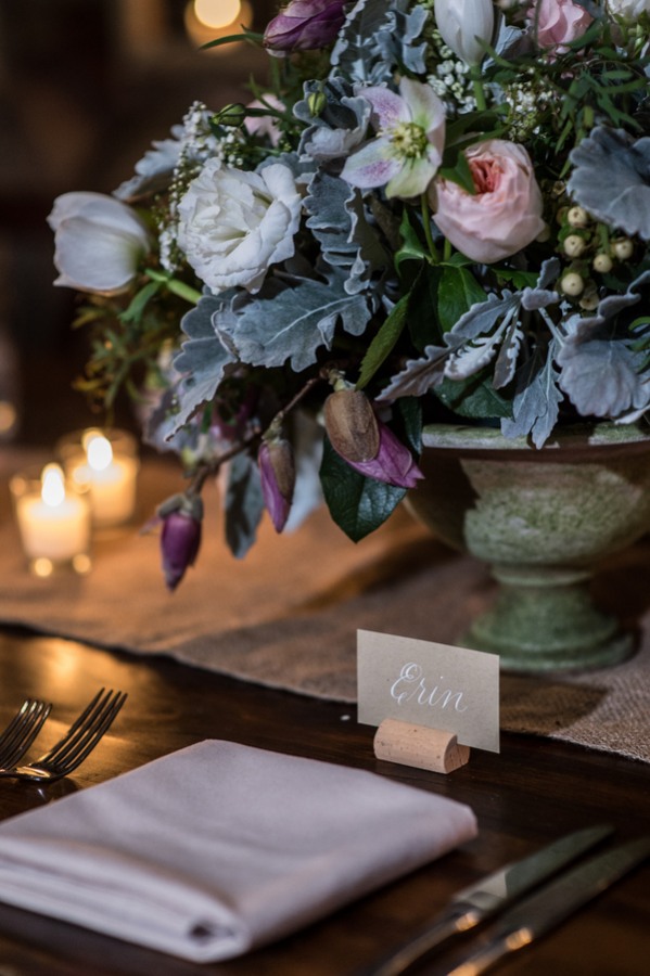“I not sure that we had a specific theme in mind when we were planning our wedding. We wanted it to be beautiful and intimate. We are typically drawn to more rustic décor and I think that played into some of our choices – venue, tables, linens, etc. Everything had to be very family friendly – we had 14 adults and 12 kids at our wedding and reception.”