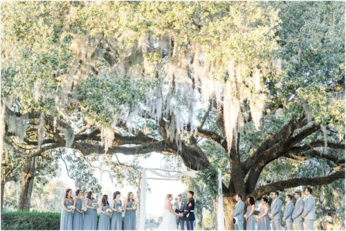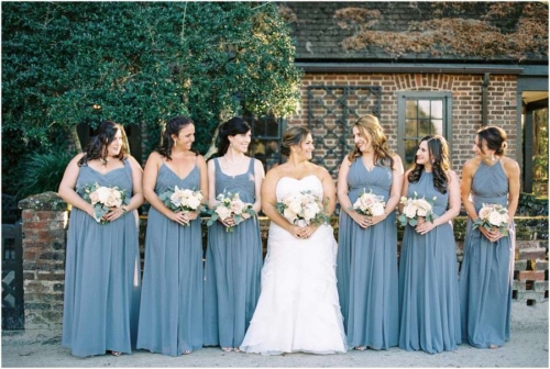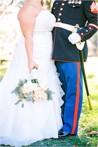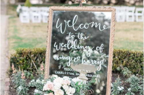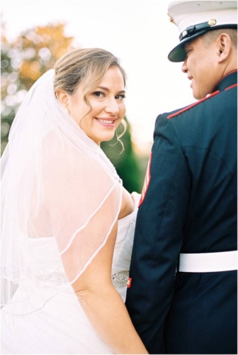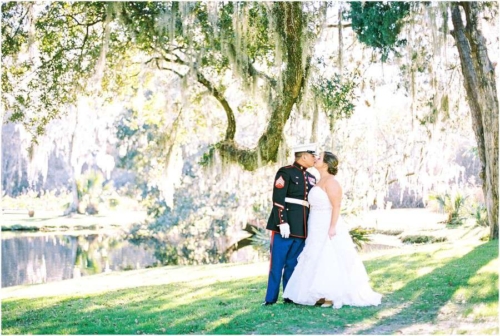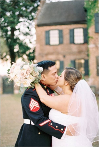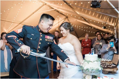 Photographer’s Remarks: “Harry, who is in the military, & his groomsmen took a little trip to the Yorktown battle ship for their photos – He was pumped about doing these photos as far back as the summer when we were doing the engagement photos downtown and you could see the ship behind them. Harry wore his military uniform. “The ceremony was a beautiful blend of Amy’s Jewish heritage & Harry’s Filipino roots. Harry’s younger brother brought up coins for the Filipino coin ceremony and all the parents came up to drape a veil & cord over the couple. The coins are a reminder of good stewardship for the couple, the veil reminds them that they belong to each other and no one else, and the cord symbolizes an infinite bond of love that keeps the relationship strong. Amy’s brother was the officiant and in keeping with the Jewish tradition, Harry stomped on the glass as the crowd shouted “Mazel Tov!” before they kissed. “Fleece blankets were laid out for guests since it was chilly (even though people came from Chicago, we were about to get snow in Charleston so it was cold!). The table numbers were based on how many steps it takes to get from Point A to Point B – like how many steps it is from Chicago to Charleston, or how many steps down the aisle to husband and wife! It really fit with the couple because they love their fitbits! My favorite wedding detail though was their cake topper: two wooden figures of Amy & Harry and their cat…and then they cut the cake with Harry’s sword! “Halfway through the parent dances, Amy invited her mom & brother up to share a dance and Harry invited all of his siblings to the dance floor. It was just two really sweet moments that they got to share with their families.”Gallery