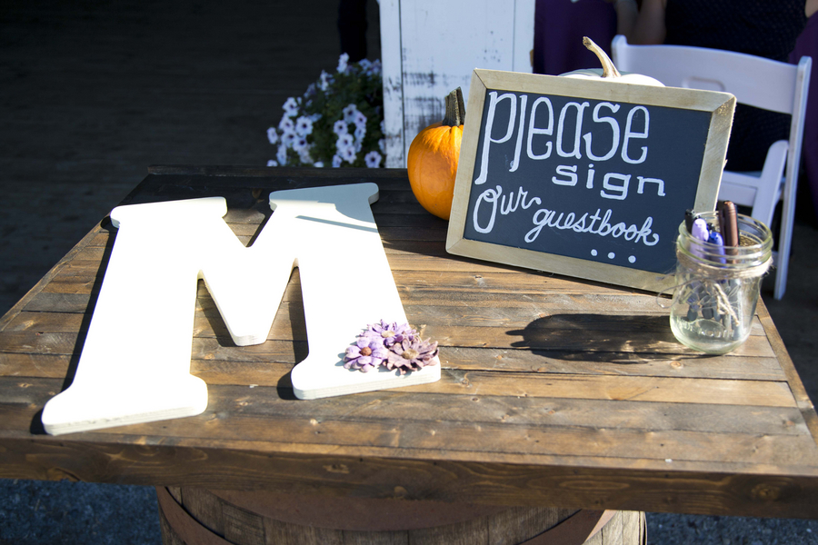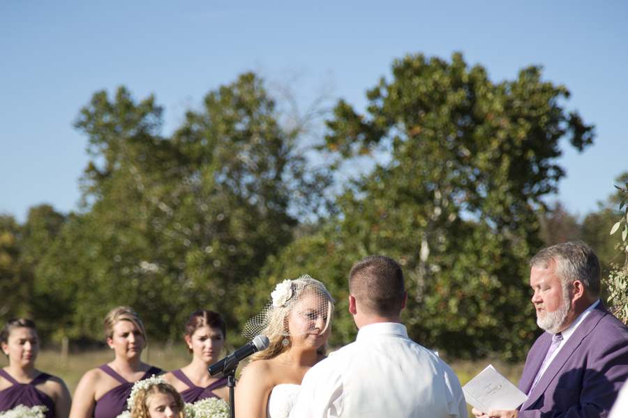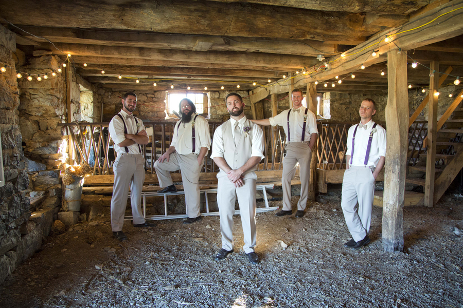 The bright purple colored bridesmaid dresses, florals, and decor adds a vibrant burst of fun to this wedding at Cloverdale Barn in Virginia. We love the rustic atmosphere with bails of hay, groomsmen in suspenders, and classic barn reception venue.
