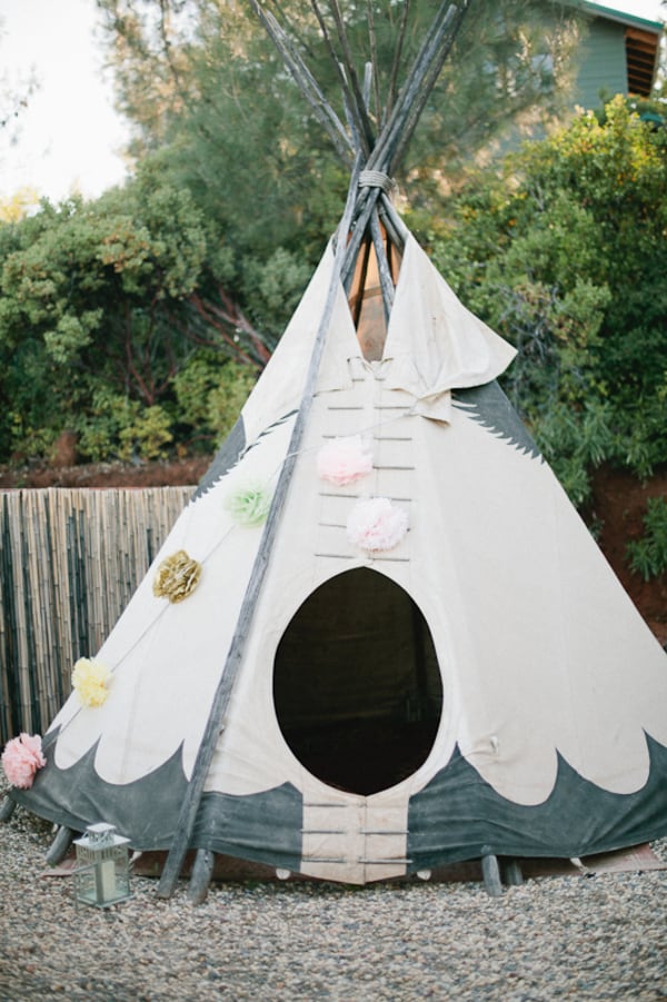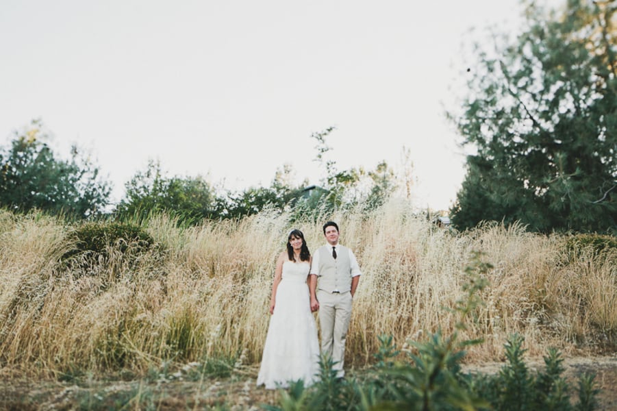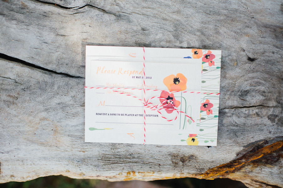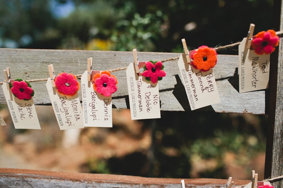 All the flowers were bought at a local farmers market and arranged by friends and family members. Guests were asked to pick up hiking passes, which led them to tables named after different trailheads. The favors were little jars of honey from the bee farm of Tom’s parents, with sweet little tags that read “Meant to Bee.”