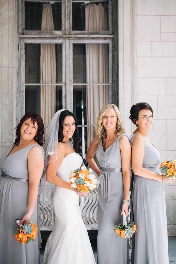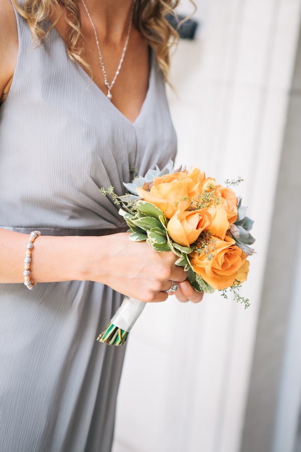 “I ultimately wanted my bridesmaid to be comfortable. They all live in Ireland, but I decided to source the dresses from David’s Bridal here in the states. I emailed them the link, and asked them to choose their favorite dress. They each came back with their top three choices. One dress made the top three on each list, and that’s what I went with! I let them wear shoes of their choice, again, wanting them to have complete comfort. I choose the color grey, as I wanted the succulents in my flowers to be a main focal point, and I thought that grey dresses would blend perfectly with my flowers and venue.”