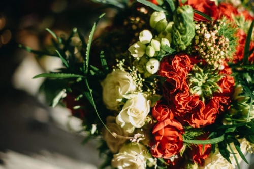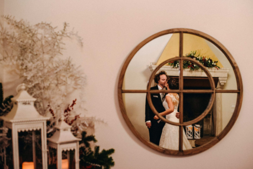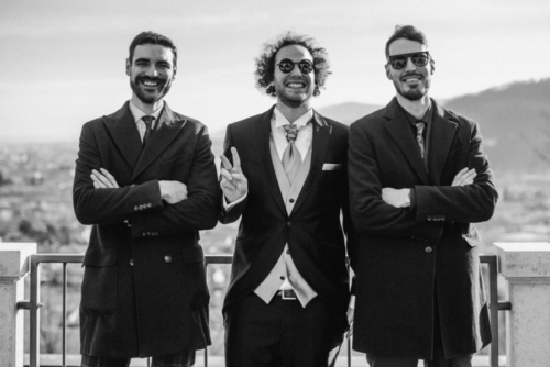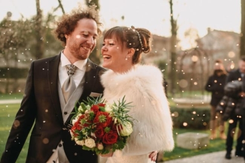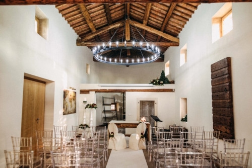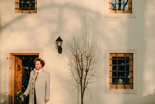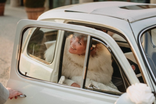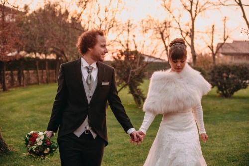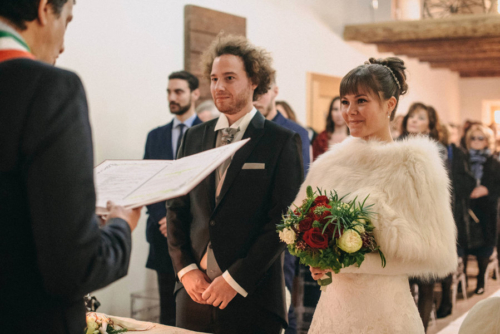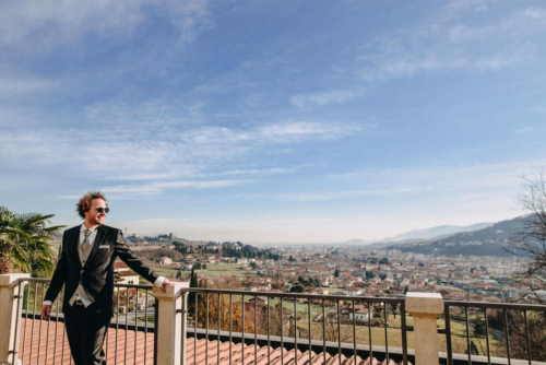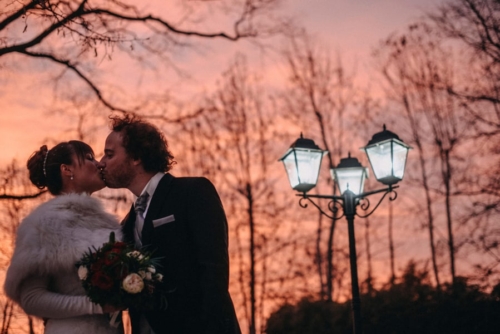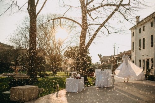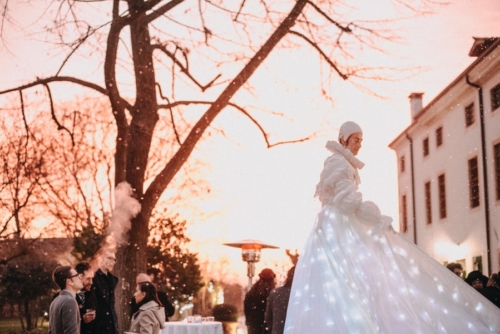 Photographer’s Remarks: “A Christmas-themed wedding in Italy, on December 23rd on a Modern Villa in the Veneto Countryside. “Anna and Alessandro’s wedding was simply a winter-wedding wonderland: Christmas trees, Christmas-movies as a theme of the tableau de marriage, actors and stilt walkers, fake snow and Santa Claus too! “Their wedding day started at Alessandro’s parents’ house, a stunning villa on the hills. There he got ready with his best friends, and it was such a great fun! “Then I moved to Anna’s parents’ house. There, all her family was waiting to see her in her wedding dress – she was just stunning! “Both she and her family got super emotional as she went down the stairs to the room where the bridal party was. She is the only female child and she has three brothers – they were all so excited to see her in her wedding dress! “Then we moved to the beautiful Villa Sorio, where the wedding celebration took place. Two actors of the Acqua Alta company where on stilts in stunning beautiful dresses, and some fake snow was falling – it was simply incredible! “Anna got there on a Fiat 500 – the moment she and Alessandro met was simply unforgettable. “Anna and Alessandro got married in a lovely civil ceremony inside the villa, among so many laughs and happy tears! “After the ceremony we had some couple photos in the sunset hour – the color of the sky was so perfect, I couldn’t wish for anything better! “As the dinner went on, Santa Claus arrived for the happiness and excitement of the kids (it was December 23rd, after all!) “After the dinner, a fire-eater played with fire leading the guests to the area where the cake was cut. It was a stunning show!”Gallery