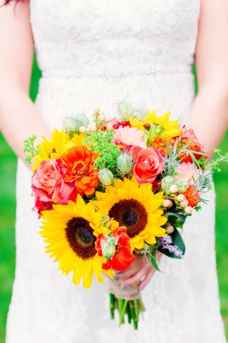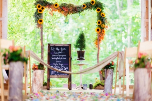 “I LOVE FLOWERS! We have the most amazing arrangements that were absolutely perfect! The bouquets had magical and colorful late summer designs featuring sunflowers, wildflowers, terracotta roses, pods, berries, and fresh herbs throughout. “We had the boutonnieres with pods, berries and fresh herbs as well. “Our aisle decor consisted of varied heights of woodland stumps topped with a light velvet moss, freesia, eucalyptus leaves and berries; creating an inviting path for our aisle potpourri of early autumn fall blossoms including black eyed susans, dahlias, zinnas, roses and so much more. “We had a exquisite natural wood canopy which was graced in a bountiful floral garland with bay laurel, eucalyptus, sunflowers and hydrangeas which aided in our intimate backyard/garden theme. Throughout the venue we had weathered terracotta pots filled with fresh herbs that smelled divine along with whimsical wildflowers and enchanting sunflowers along with so many other accent floral pieces.”Describe the ceremony