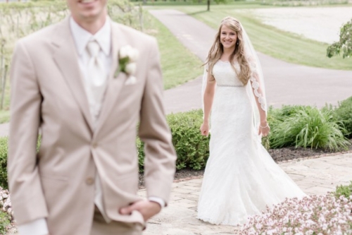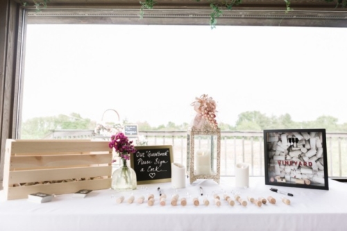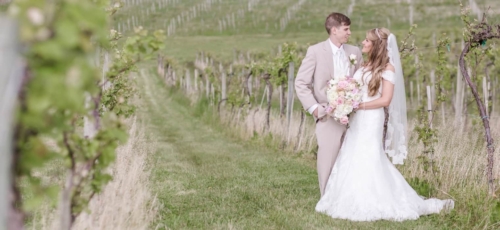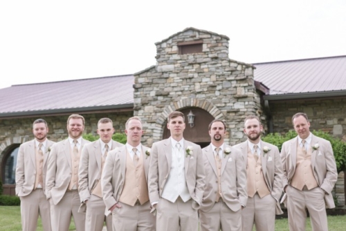 Photographer’s Remarks: “Ashley and Andy’s big day at Chateau Pomije Winery was perfect! Â Blush pink dresses, gold details, moody skies and a beautiful vineyard. Â The bride wore a lace gown with a fingertip veil and the groom and his guys donned neutral beige tuxes that added to the light, romantic vibe of the day.