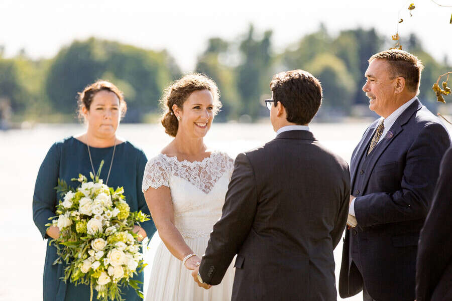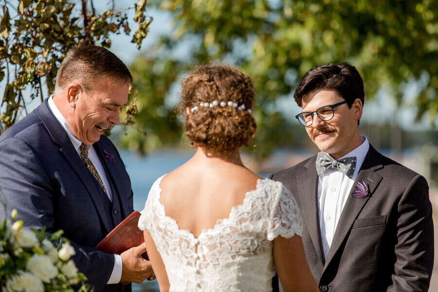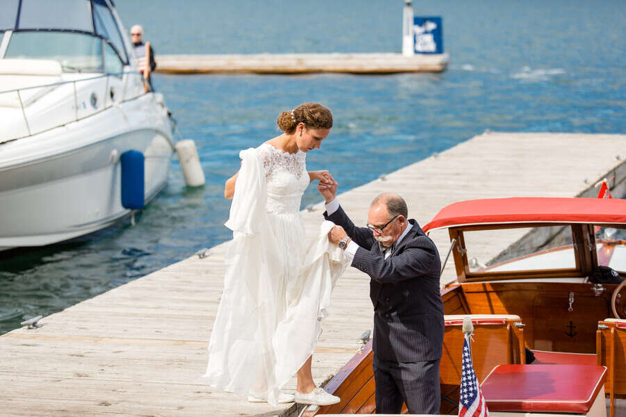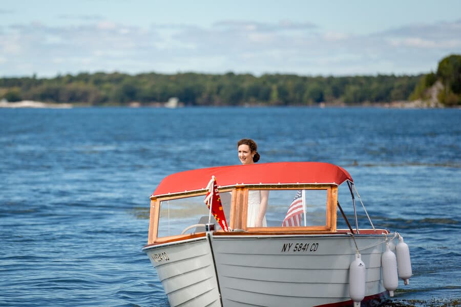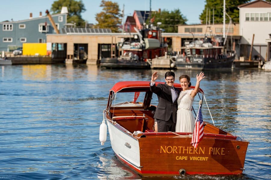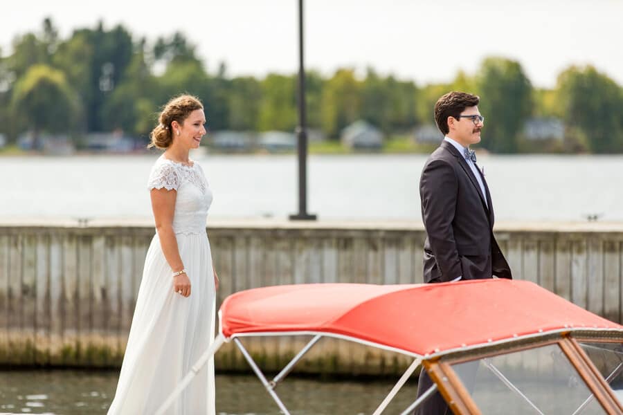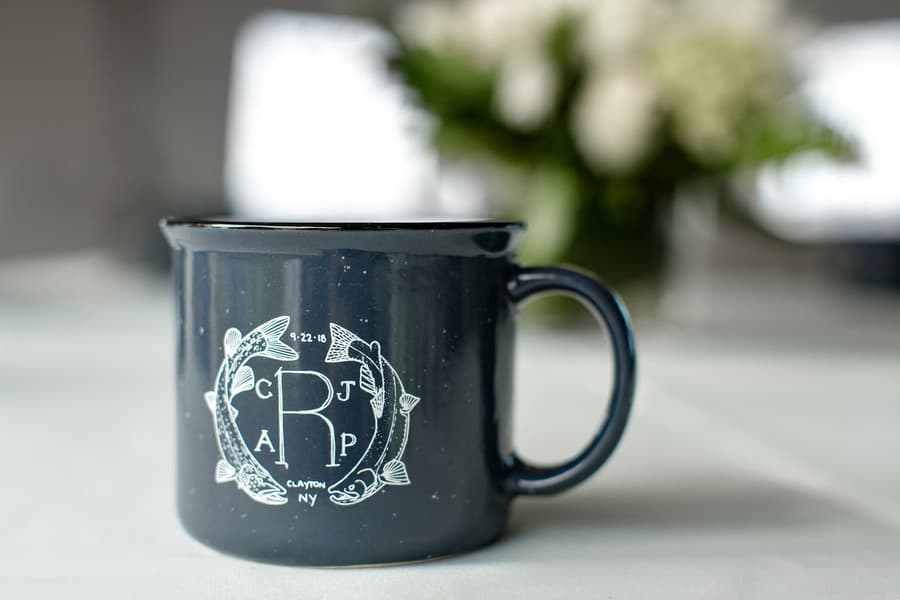 Photographer’s Comments: “If you spend any time in the Thousand Islands, then there’s a good chance you’ve been to the Antique Boat Museum. But you haven’t really lived until you’ve been to a wedding at the Antique Boat Museum! “We’re really living it up these days, because we can now say that we’ve been to TWO Antique Boat Museum Weddings, and we’d be over the moon to do it again! “It doesn’t happen a lot, but we met Ashley and Caldwell all of about five and a half seconds before their wedding. I kid, we actually met them a few hours before they tied the knot. But our communication prior to the big day relied solely on modern technology, since they live on the West Coast. We do recall, quite vividly in fact, their first message to us on a Sunday evening. “Not all couples start out contact with details, or niceties, or even much information about themselves. But Ashley and Caldwell really outdid themselves with a sweet message, compliments and lots of information, before they even knew that we were available. I must admit, we’re a couple of suckers for anyone who writes as though they’re having a real live conversation with you. To say we adored them from the beginning would be an understatement. You ever just get this feeling that a couple were made for each other? That’s Ashley and Caldwell! “It was an idyllic September day on the St. Lawrence, with blue skies, plenty of sunshine, and unseasonably warm temperatures. There was really nothing more that we could have asked for to make the day better. “Their wedding day details included a beautiful bride, a handsome groom, hand-tied fishing flies made by the groom, and a pair of glitter Keds. Everything that they chose to be a part of their day had a purpose, and also told the unique story of the spunky and fun couple that they are! “Case in point: their custom made signature mugs. Anyone who knows me, knows I am a sucker for coffee mugs. When I saw theirs, with a personalized logo of their Monogram and wedding date, I instantly fell in love! Now there’s a wedding favor that nearly everyone can use, and on a pretty regular basis! “Their ceremony began with a little laugh, as Percy, nephew to the bride made his entrance. He carried the rings on a fishing pole, or rather swung them, as he made his way down the aisle. Percy stole the show a few times that day, including during the couple’s first dance. There’s rarely a dull moment when you pair little kids with weddings! Following the ceremony, Ashley and Caldwell sealed their union not only with a kiss, but with a romantic ride on the river with their family’s boat. “We knew when we signed on, that there was a good chance for a nice sunset. We’ve been incredibly lucky that every time we visit the St. Lawrence, Mother Nature comes through with an impressive end to the day. She did not disappoint, but rather gave us our second mind-blowing sunset this fall. It was so magnificent that we kept shooting as many group portraits as we could before it disappeared. We rounded out the day with lots of energy and enjoyment on the dance floor “Though we didn’t meet them until the day of their wedding, it certainly didn’t feel that way. It felt like we’d known them forever, and they were such an amazing two-some to work with. Their wedding was memorable in so many ways, and every time I sip my morning coffee from their souvenir mug, I will undoubtedly enjoy the warm memories they left us with, until we meet again!”Gallery