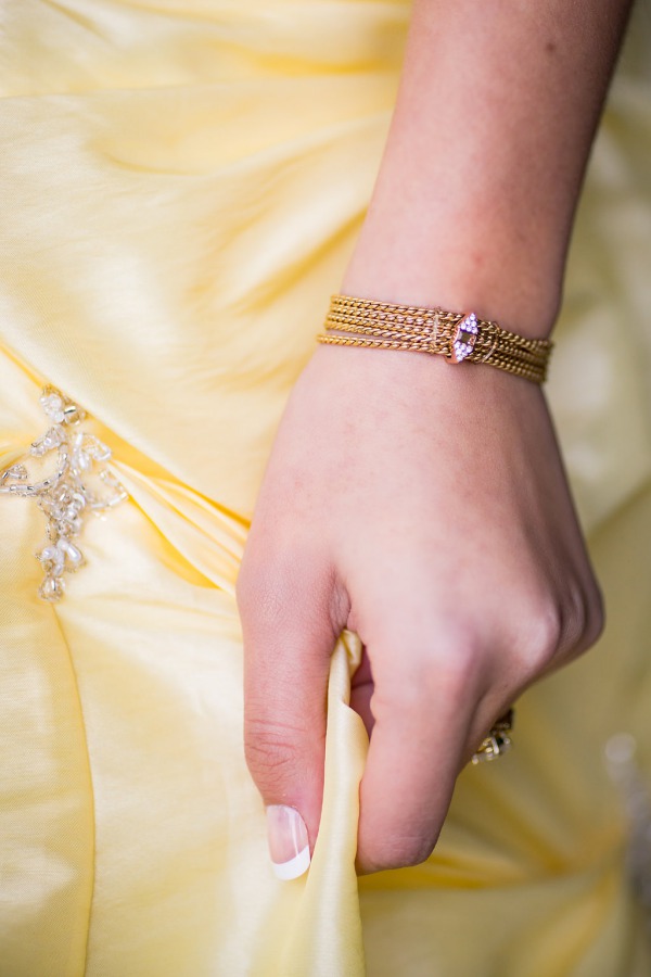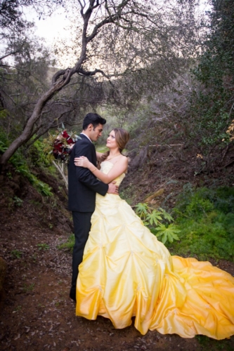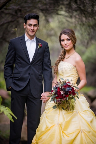 “We updated our Belle’s look by dip dying a dress in golden yellow and orange dye for a super current ombre look. Our beast/Prince Adam did not wear a tie, just as the Prince did not wear one once he wasn’t a beast anymore.”