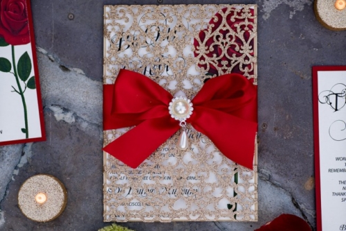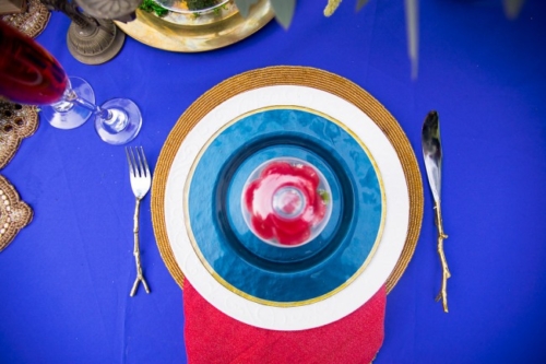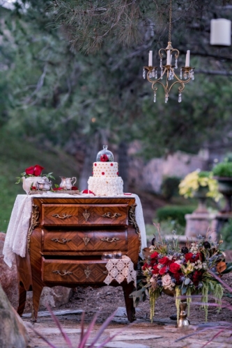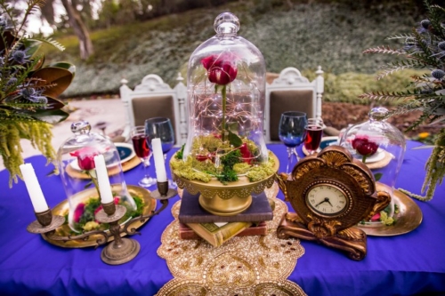 Today’s glamorous Beauty and the Beast styled wedding doesn’t hold back. Bursts of color coordinate well with floral bouquets, attire, and the type of decor you would expect to find — clocks, tea cups, and a red rose under glass. After recently featuring a daring Pirates of the Caribbean themed shoot, the team behind this styled shoot deliver yet again with a superbly crafted piece of wedding inspiration.