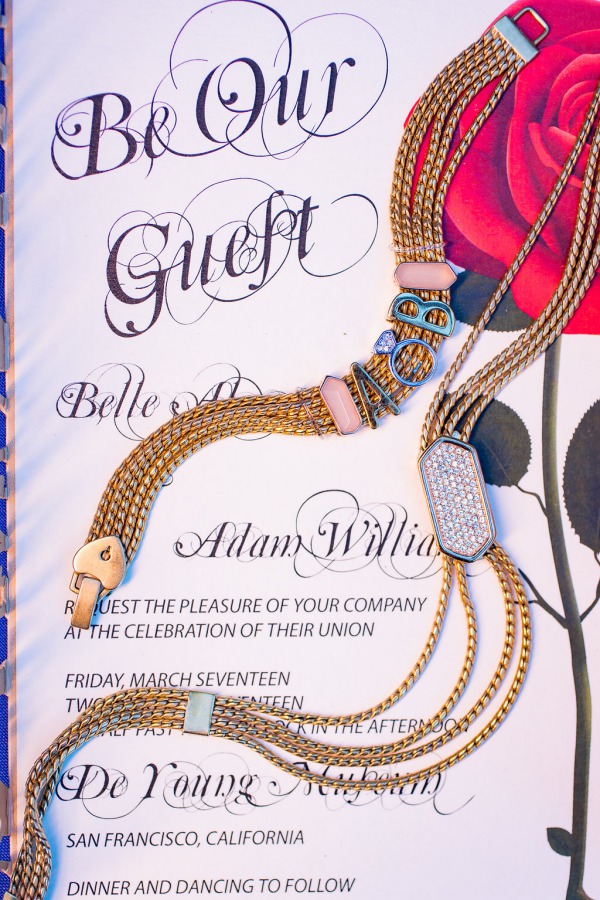 “We included all kinds of brass and antique looking details such as the couch and clock like you may find in an old castle. Easter eggs like the dresser, chip, candle stick holders, book seating chart, and red florals can also be seen in the design. We also included current details like the slider charm jewelry, sparkly shoes, blue florals, star/led lights, chair, and painted wooden signs.”